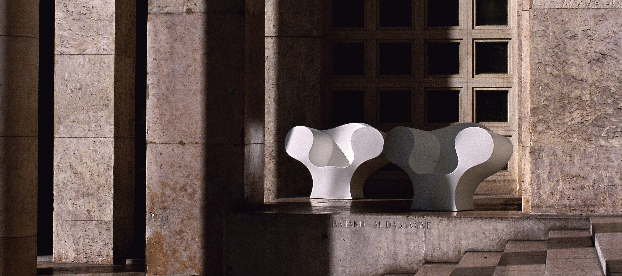 由Ron Arad在1988年设计的一个大的简单的钢椅,展示了一种简单的形式,可以在不影响设计原则的情况下,通过对材料和生产过程的重新解释而被翻译。从建设性的姿态获得的模型变成了工业生产;视觉的柔软和丰满的体积,舒适。更容易探索旋转模制和聚乙烯的使用;在冷泡中柔软的版本,用聚酯纤维包覆,触觉表面的转换;在元素的集合中,形态学和动态形式。