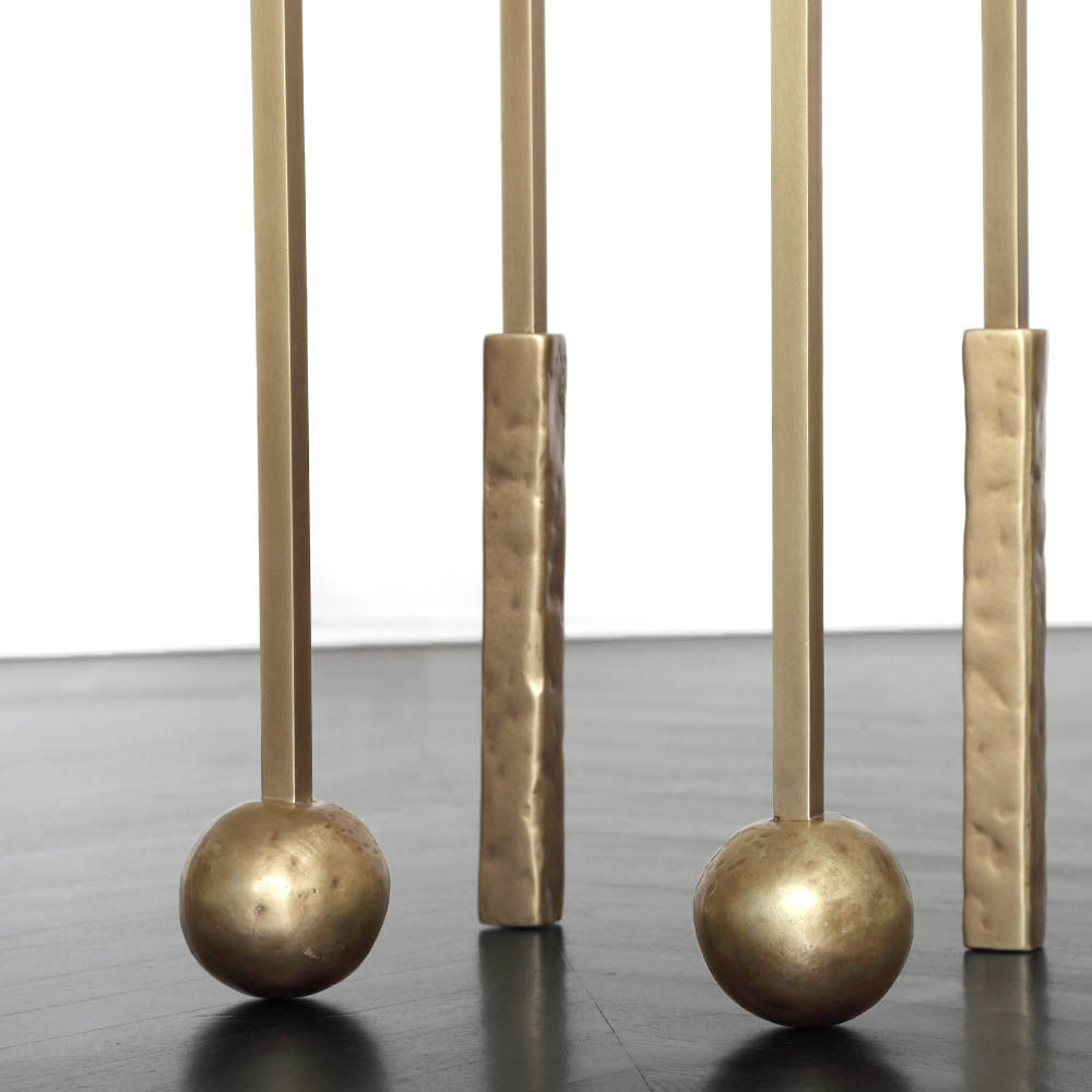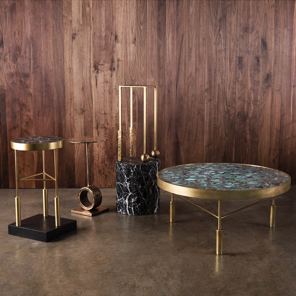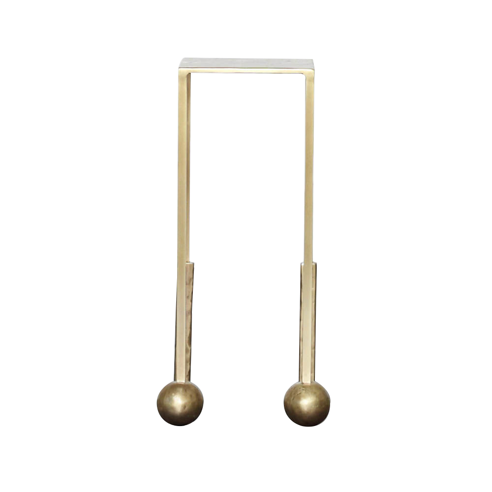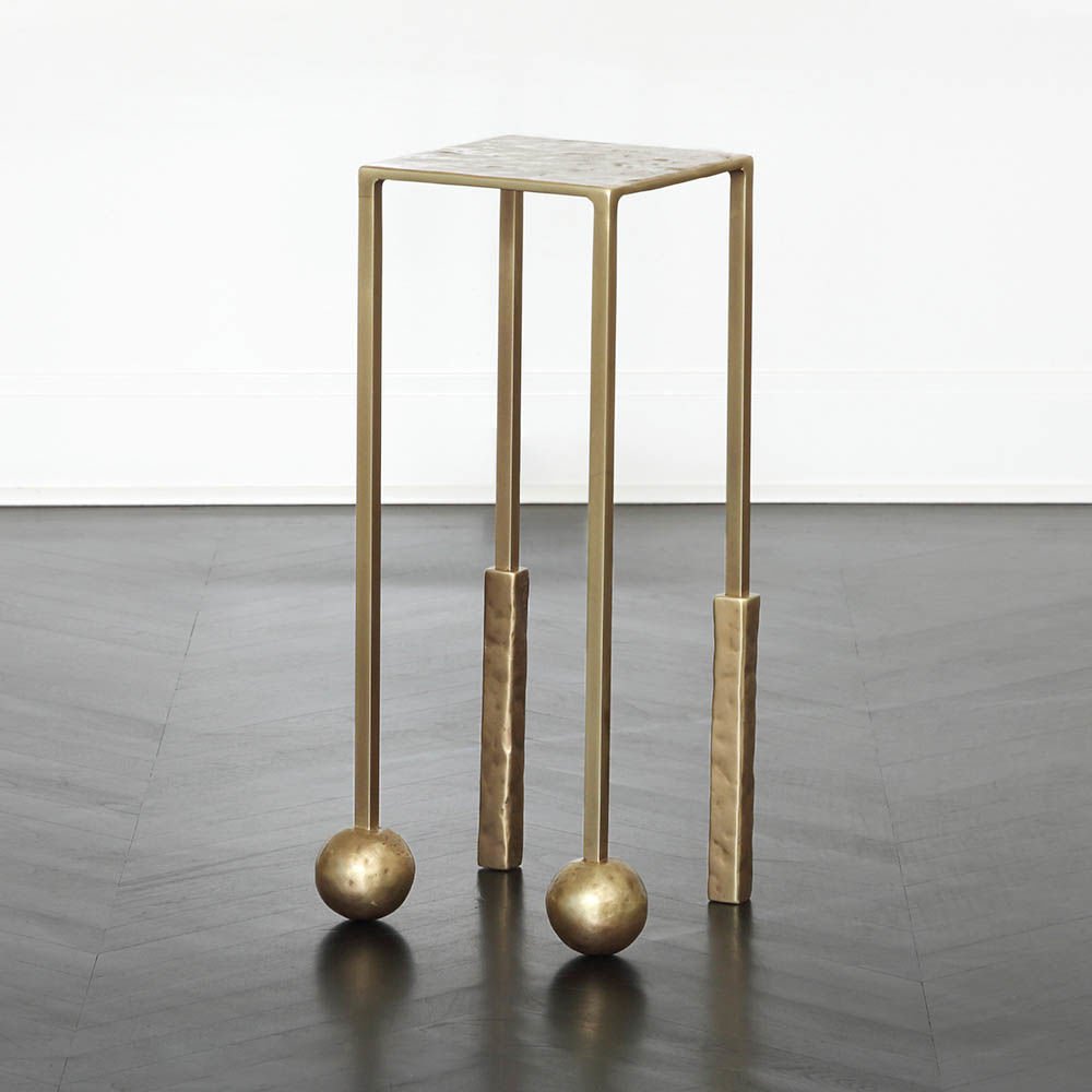 Nimes Petite Cocktail Table(尼姆小巧鸡尾酒桌)采用铝合金手工砂铸造,然后采用光泽抛光黄铜饰面,赋予作品模仿的雕塑质感和坚实的手感。 桌子本身由精致光滑的方形细高跟腿组成,配有手工雕刻的铸造球体。