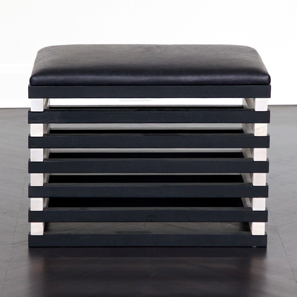 Hauser Ottoman的高对比度,交替的黑檀木和漂白胡桃木板条形成了现代,通风,雕塑般的外观,展示了纹理皮革定制的座垫。 这些凳子可以组合在一起形成一个休息区或矮桌。