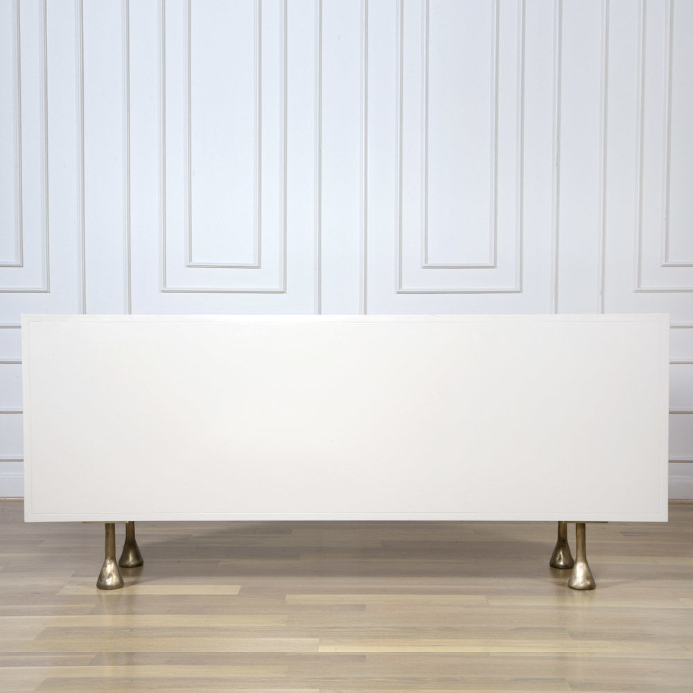 Crescent书橱的超大雕塑装饰为这款大型控制台带来丰富而不可否认的优雅气质。 坚固的美国胡桃木表壳,采用华丽的象牙色漆面漆制成,有铸造黄铜腿。 正面采用实心黄铜制成,带有手工切割的铸造玻璃中心。 内部设有四个浅抽屉,带有柔软的紧密硬件和手工雕刻的黄铜拉手,以及两个内部坚固的切割胡桃木架子。 天然胡桃木内饰,抛光黄铜抽屉拉,黄铜门拉和腿,碎玻璃。