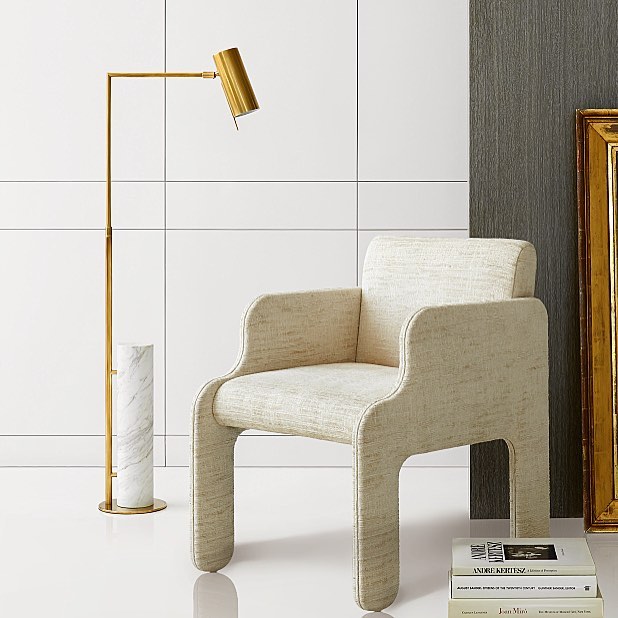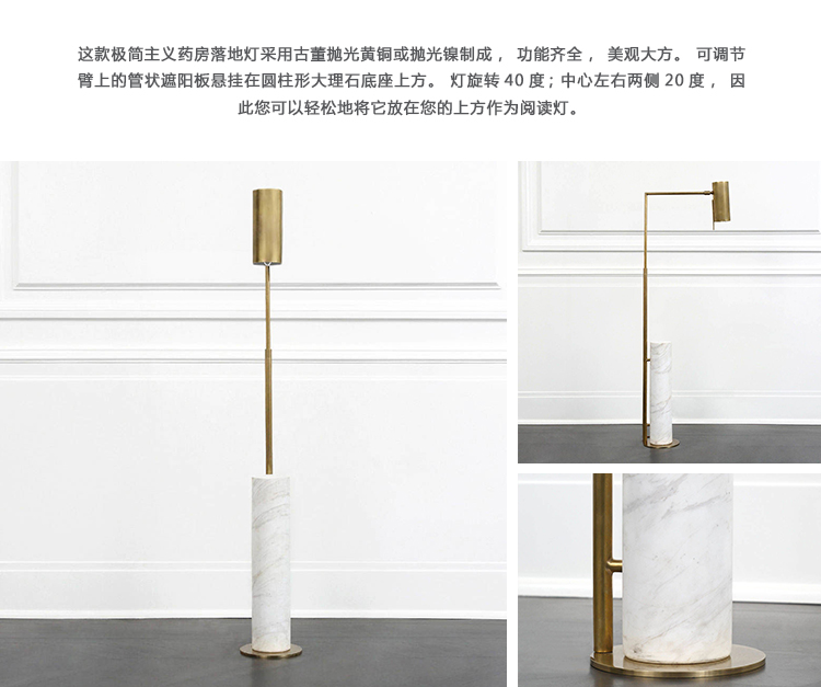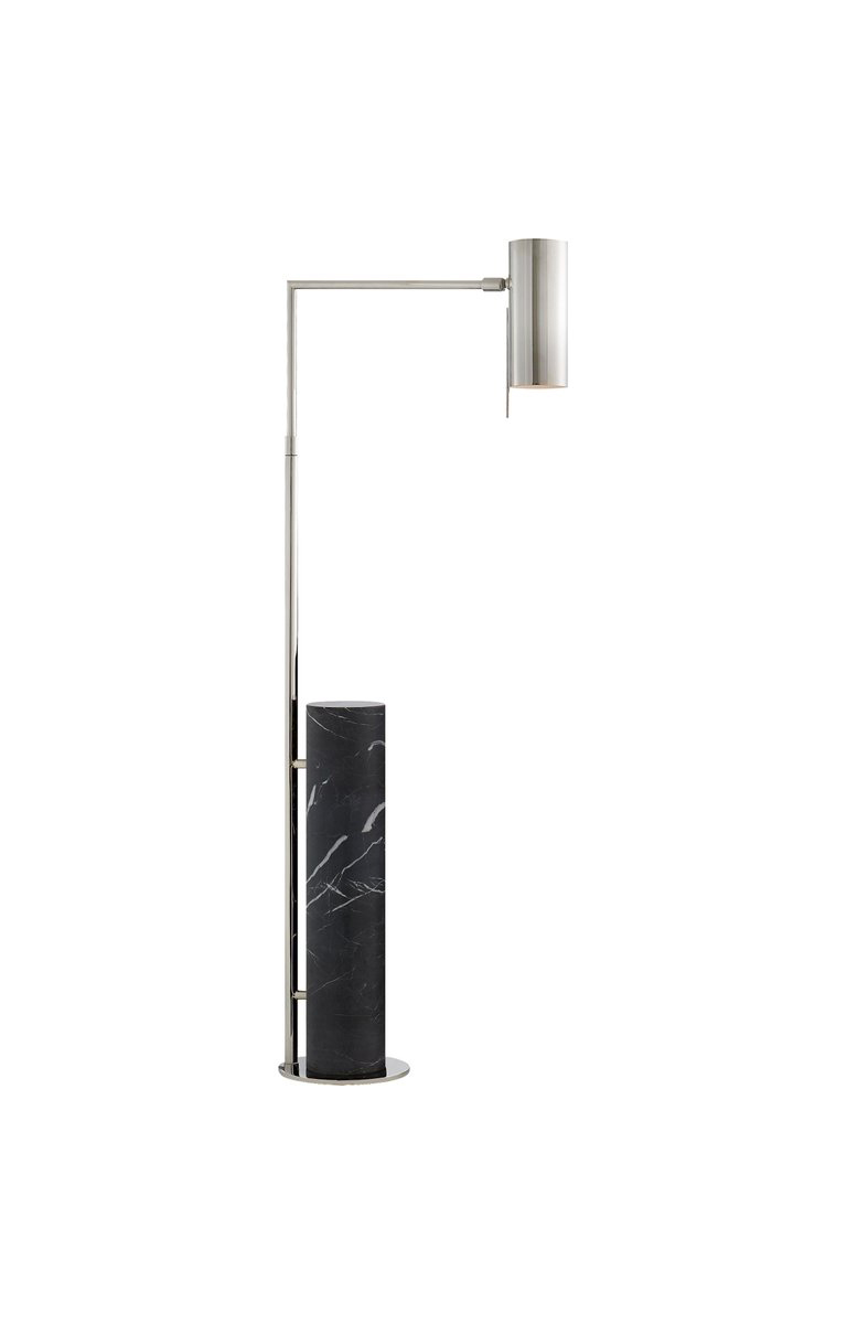 这款极简主义药房落地灯采用古董抛光黄铜或抛光镍制成,功能齐全,美观大方。 可调节臂上的管状遮阳板悬挂在圆柱形大理石底座上方。 灯旋转40度; 中心左右两侧20度,因此您可以轻松地将它放在您的上方作为阅读灯。 要进一步瞄准灯泡,请使用遮阳板上的手柄,该手柄也可以上下旋转180度。 织物缠绕的线具有易于开/关的开关。