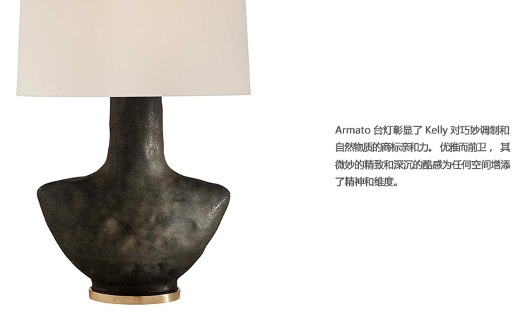 Armato台灯彰显了Kelly对巧妙调制和自然物质的商标亲和力。 优雅而前卫,其微妙的精致和深沉的酷感为任何空间增添了精神和维度。