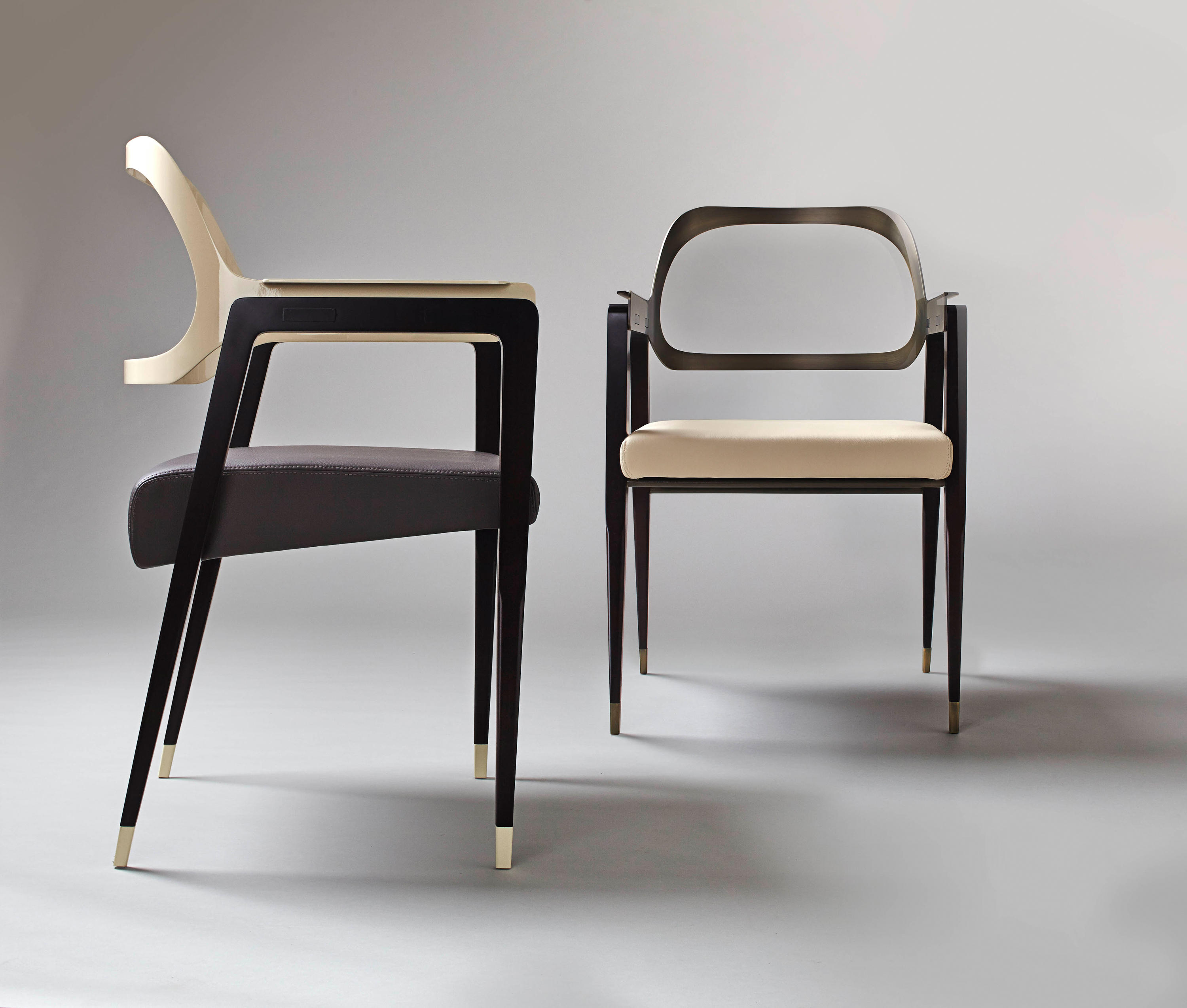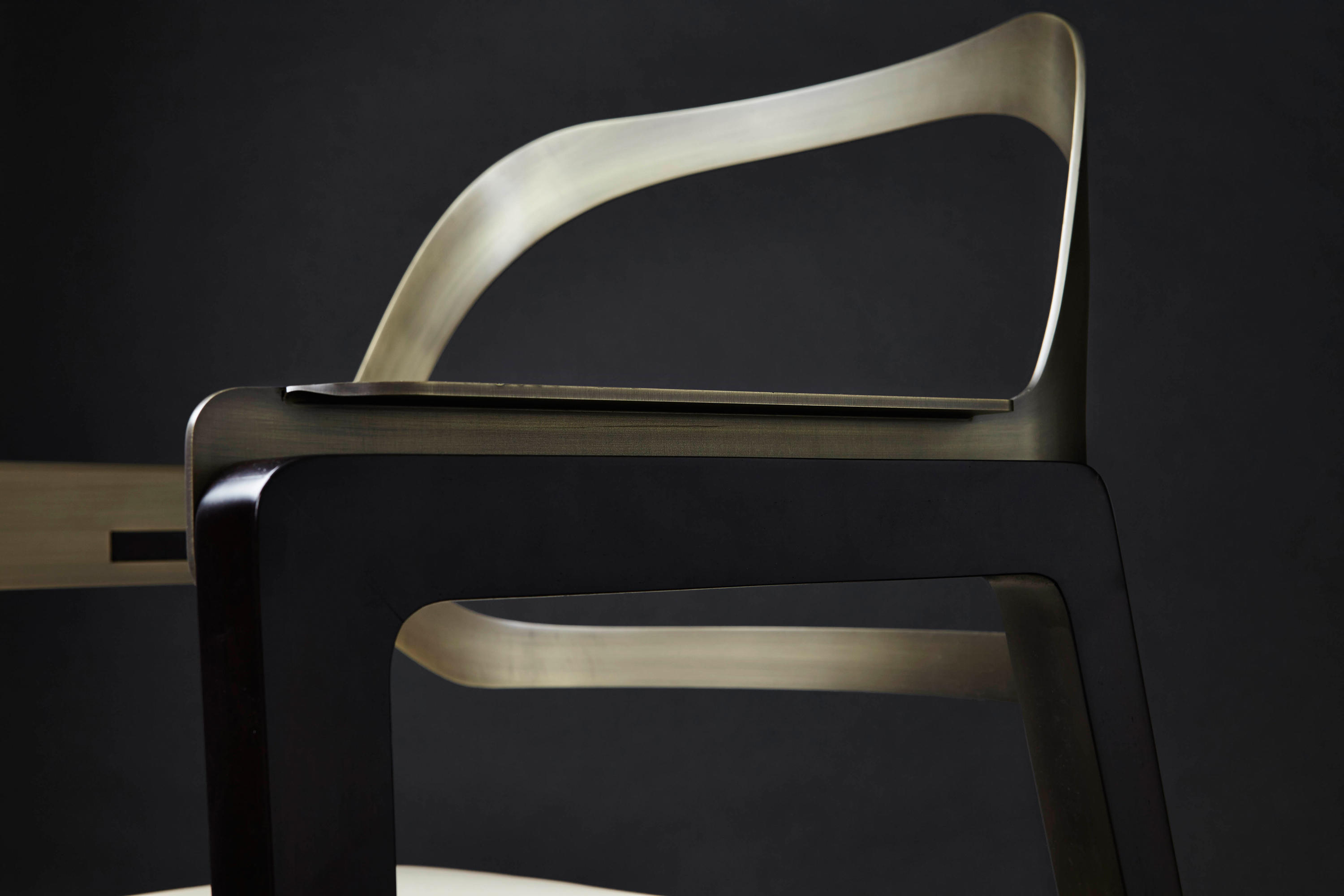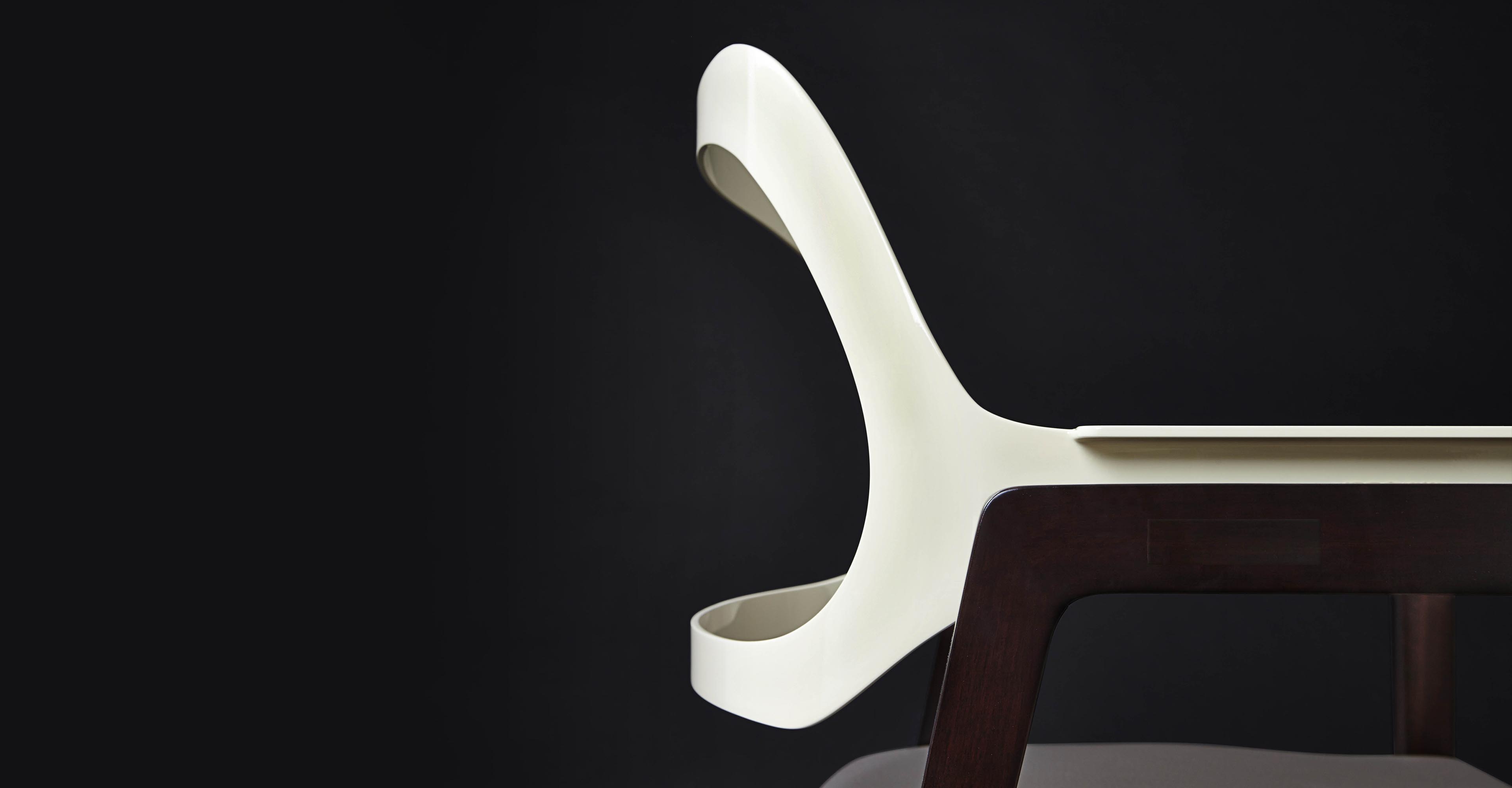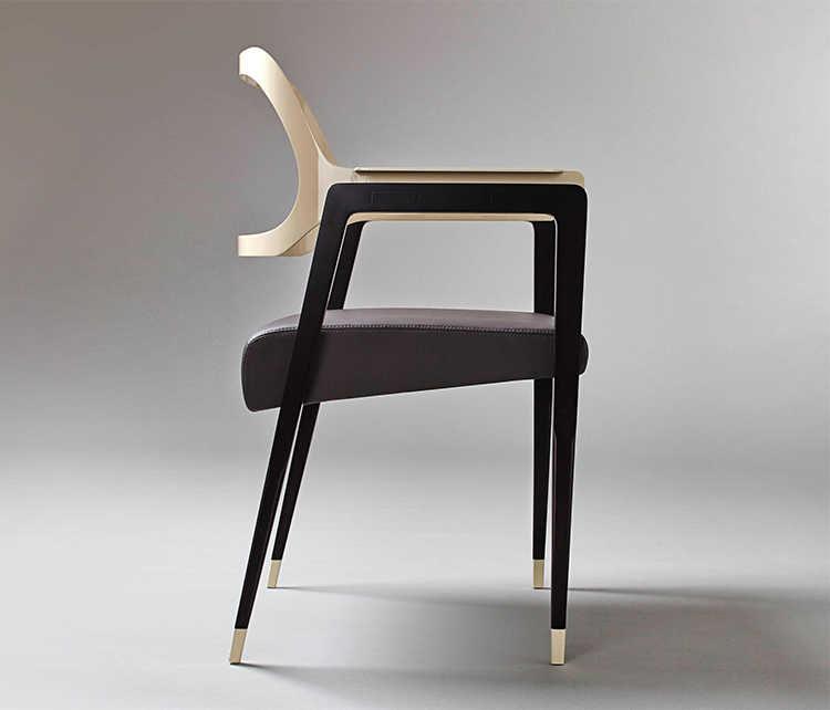 这把椅子环绕着靠背,提升了它的脚感,弯曲的轮廓,完美地融合了胡桃木贴面、皮革和抛光金属。引人注目的是比例的平衡和线条的和谐,显示出极大的优雅。有两种装修。淡奶油色真皮座椅和抛光黄铜靠背和扶手或灰色烟熏皮革座椅和象牙色金属靠背和扶手。