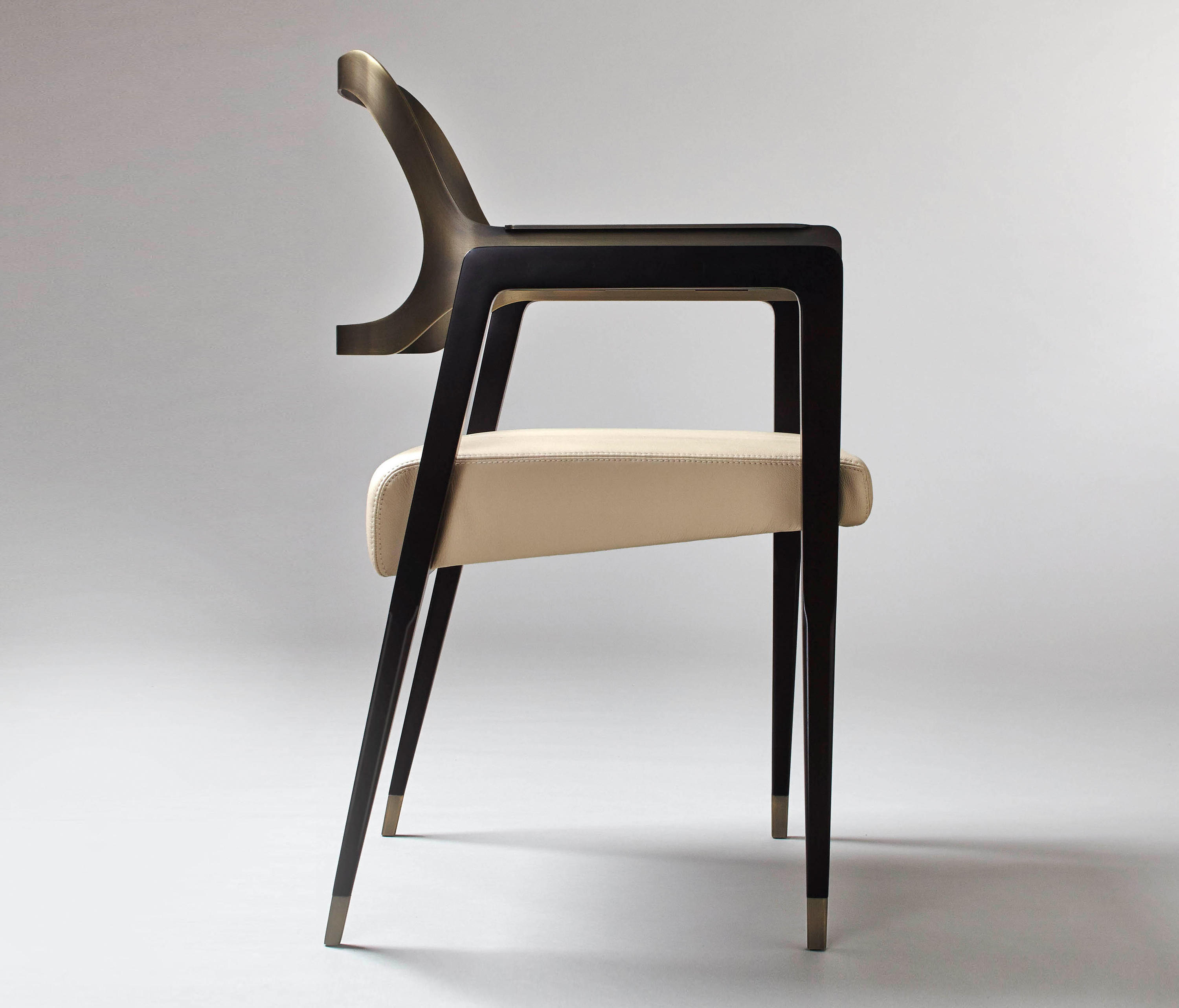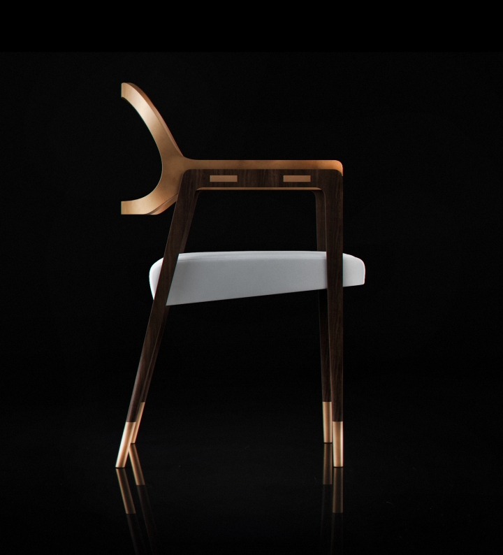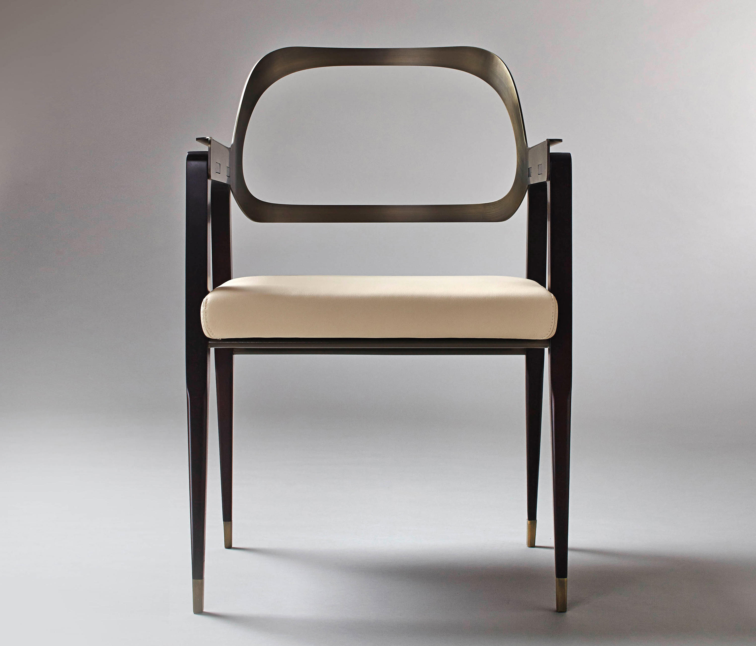 这把椅子环绕着靠背,提升了它的脚感,弯曲的轮廓,完美地融合了胡桃木贴面、皮革和抛光金属。引人注目的是比例的平衡和线条的和谐,显示出极大的优雅。有两种装修。淡奶油色真皮座椅和抛光黄铜靠背和扶手或灰色烟熏皮革座椅和象牙色金属靠背和扶手。