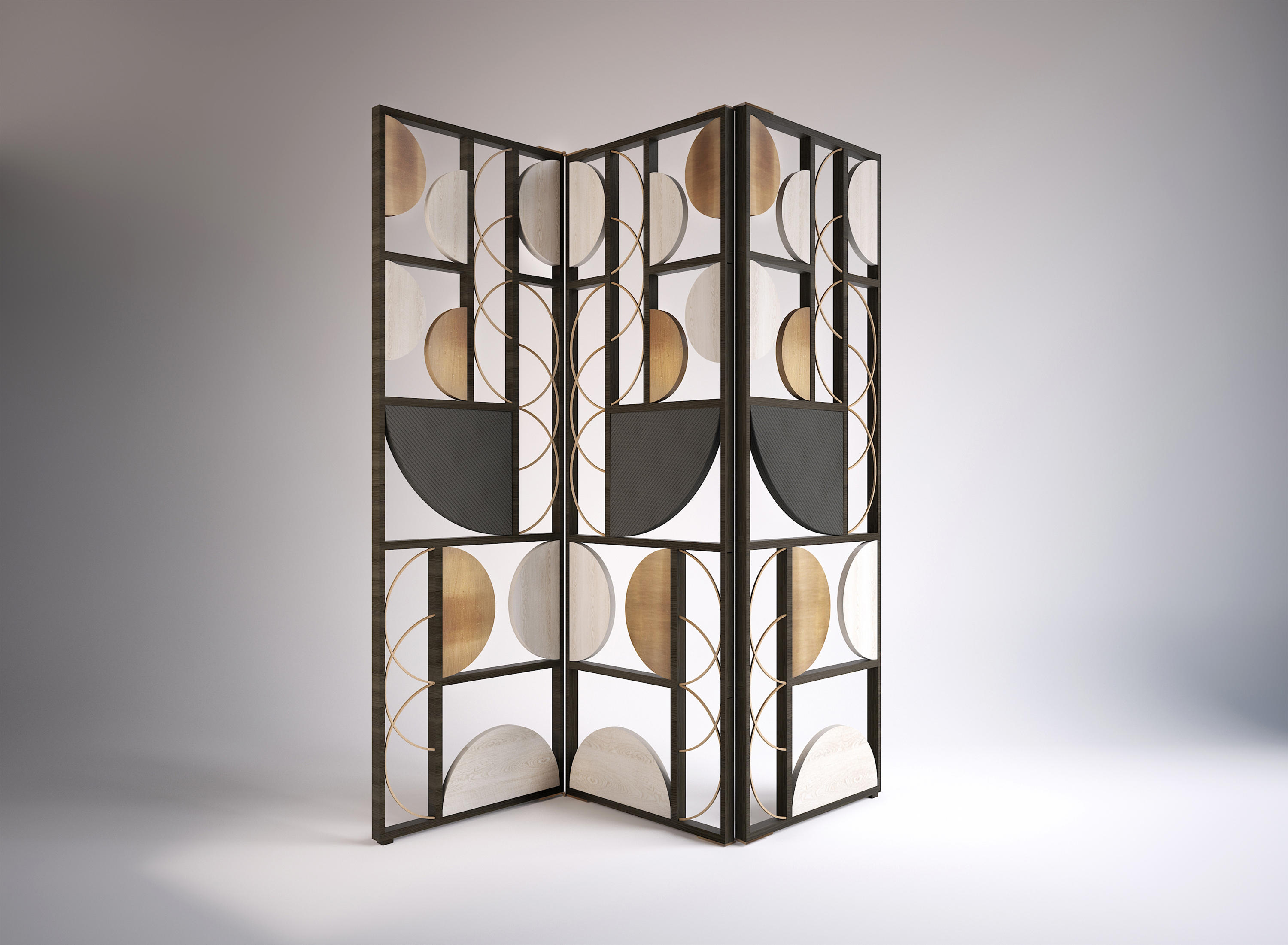 高耸的墙,同时结合和分离。 这款刺绣面料融合了复古与现代魅力,在完整与空卷之间形成鲜明对比。 材料的优雅增加了设计的强度,使其在抛光金属板中找到重心。