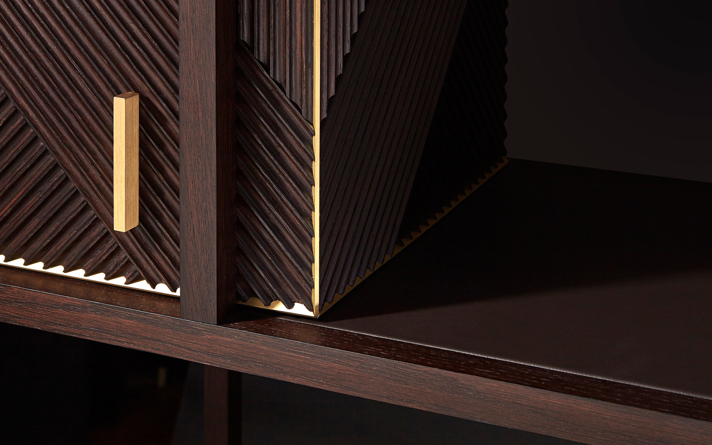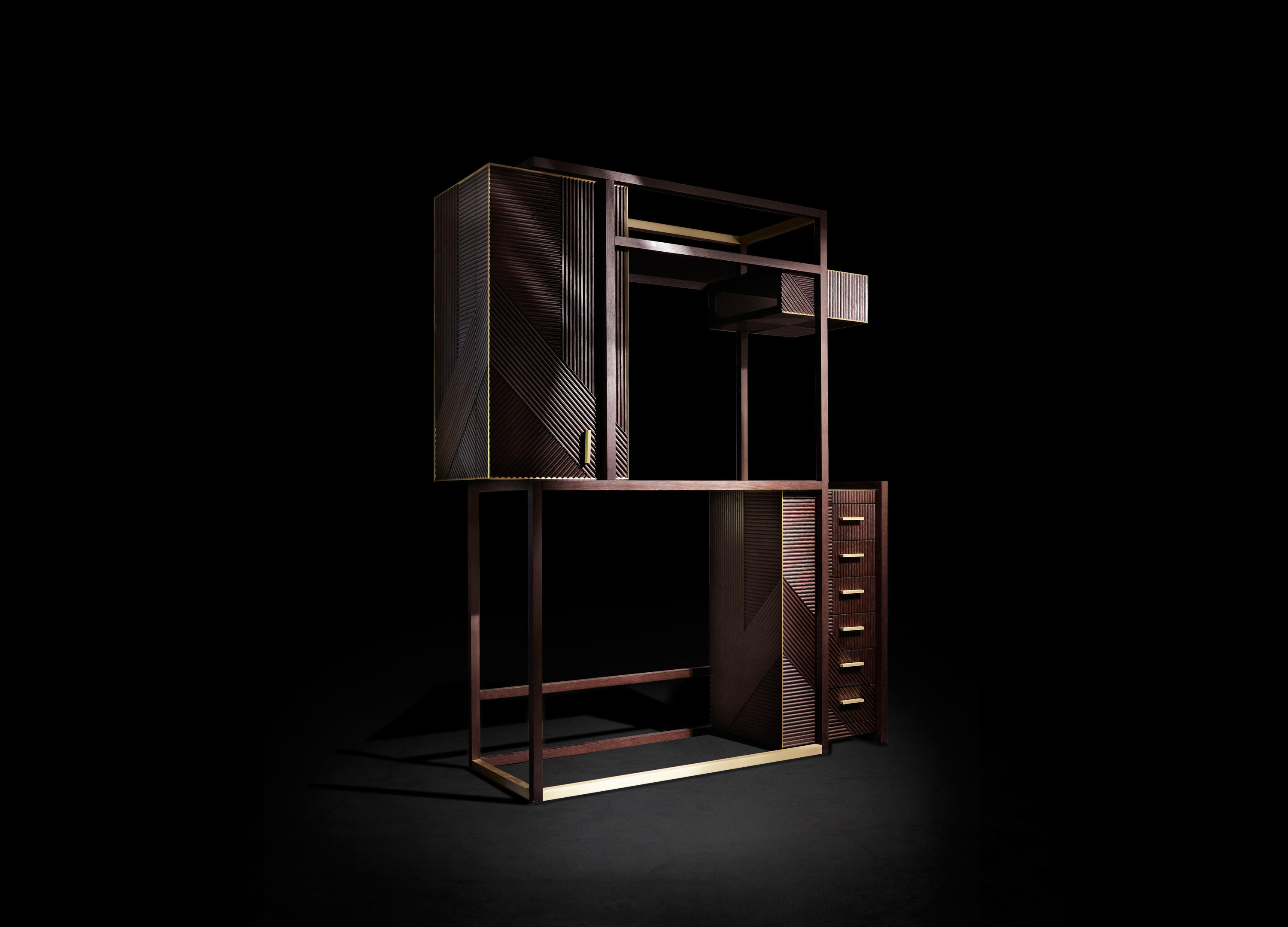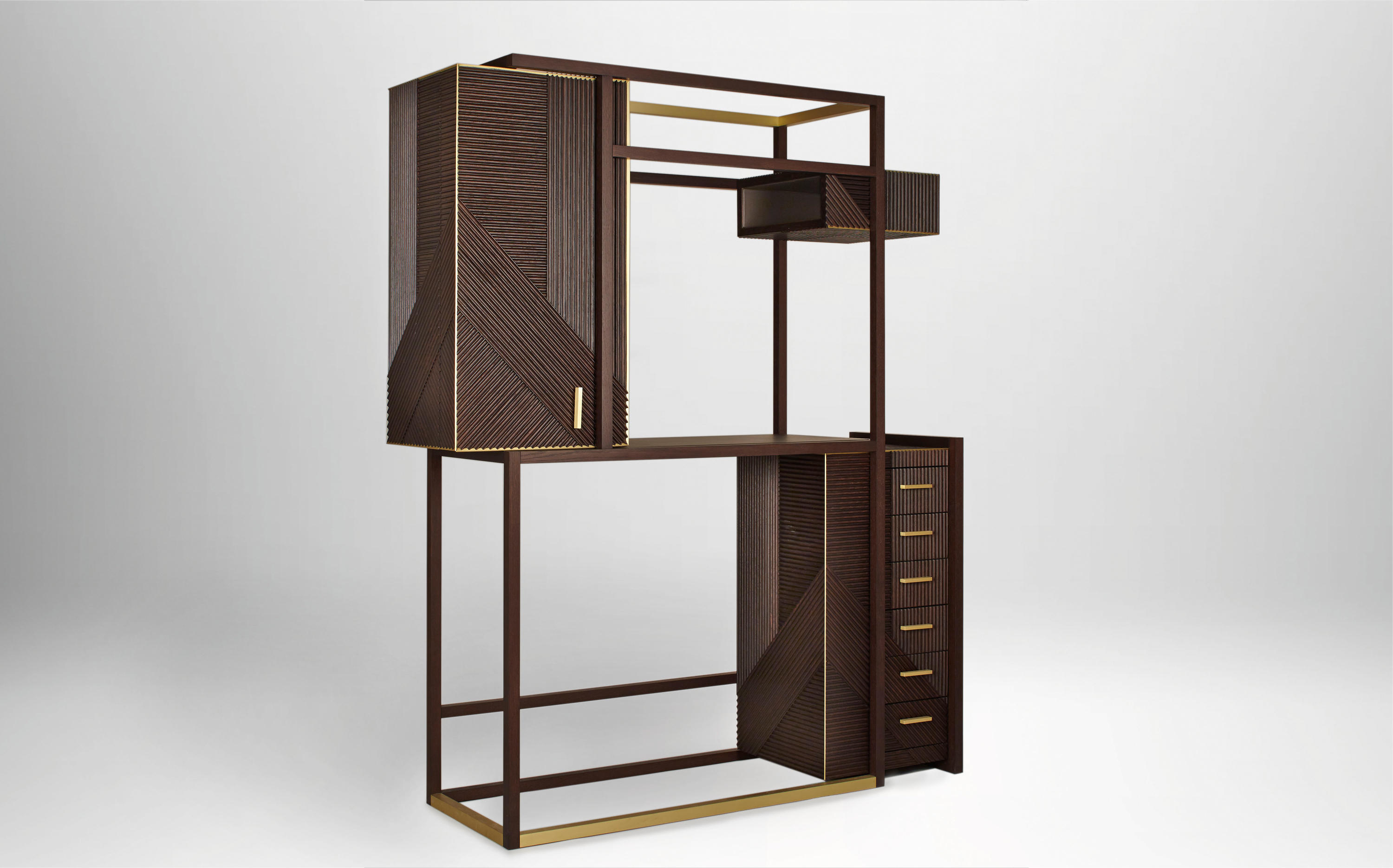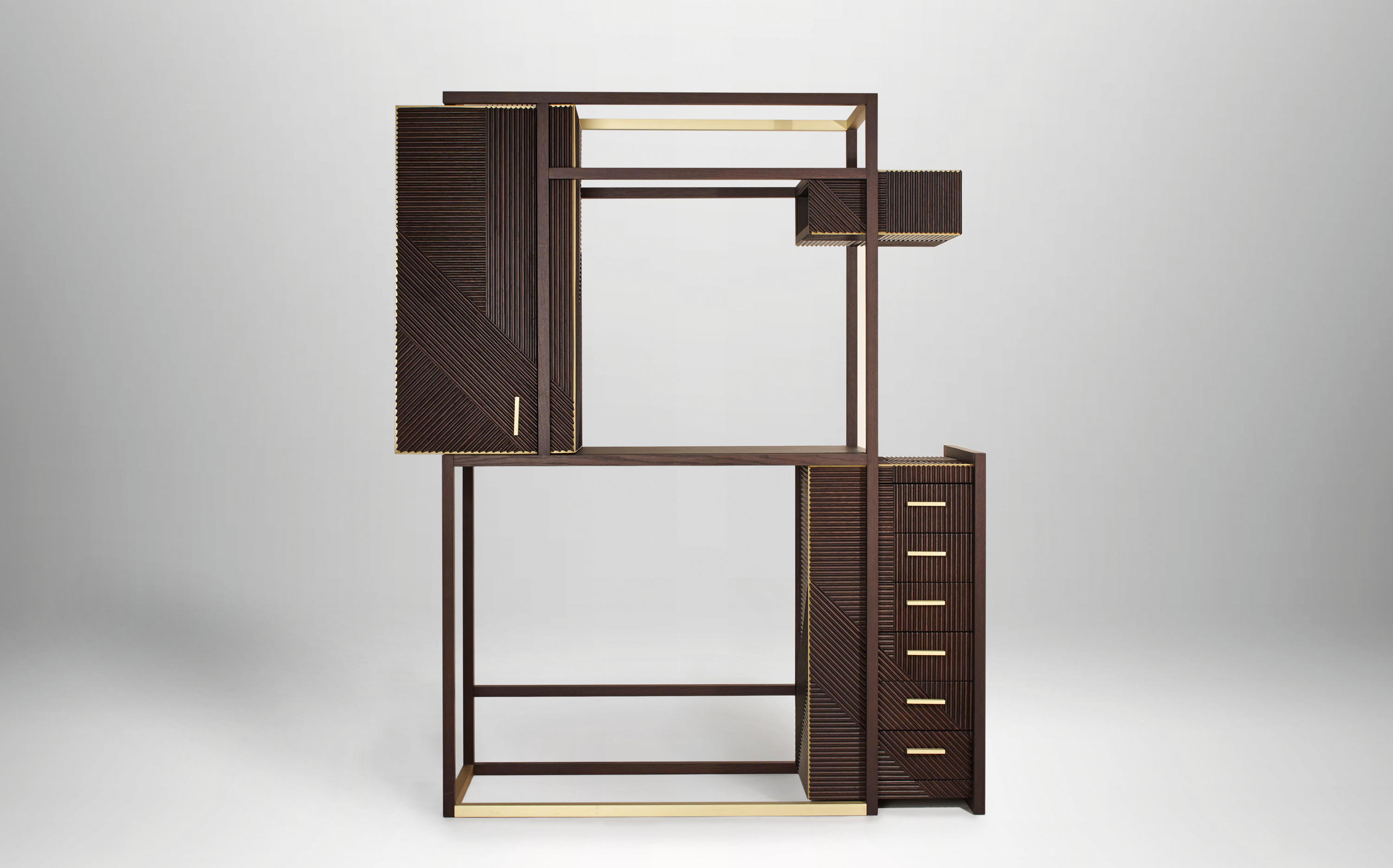 凭借其功能性设计,这款灵活的复古风格橱柜营造出简约的几何形状,并在完整空间和空间之间实现完美平衡 典型的表面处理采用交织的橡木编织,手工打磨和涂漆,具有极佳的视觉冲击力。