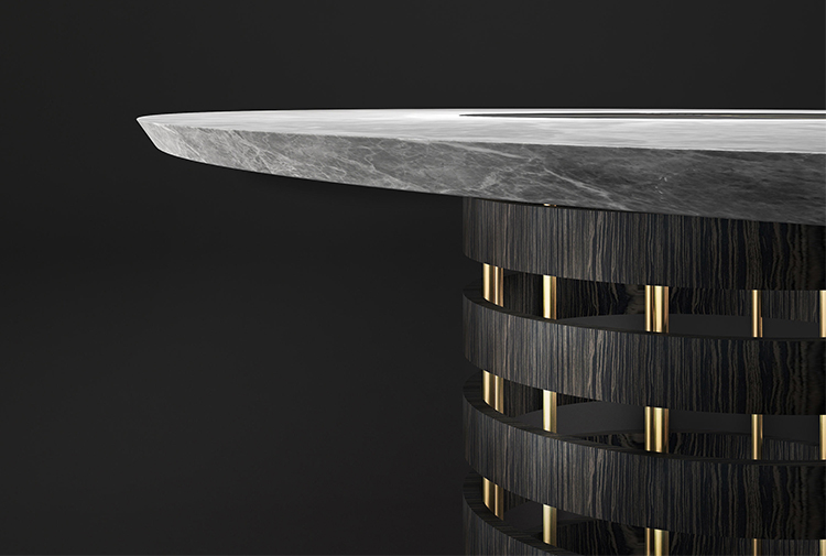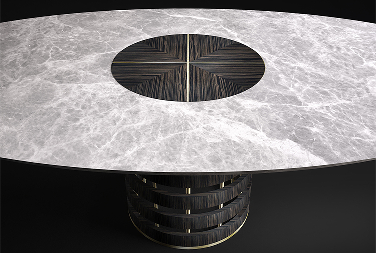 华丽华丽的桌子;木质结构支撑着椭圆形的灰色大理石桌面。同样的装饰让人想起顶部的图案,薄薄的黄铜条交织在一起,呈现出不同寻常的优雅。实体空间和空洞空间的交替与顶部的坚固性相矛盾,确实带来了意想不到的轻盈感。