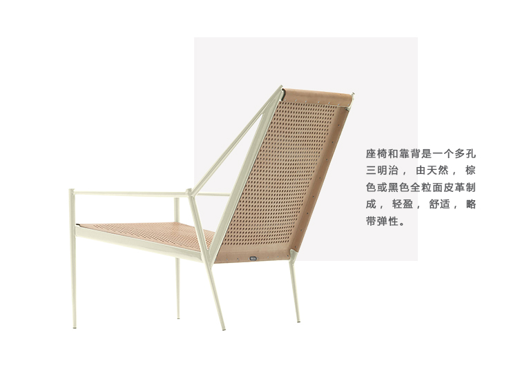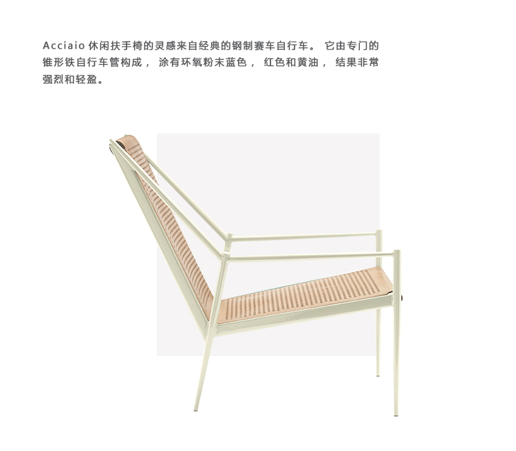 Acciaio Lounge扶手椅的灵感来自经典的钢制赛车自行车。 它由专门的锥形铁自行车管构成,涂有环氧粉末蓝色,红色和黄油,结果非常强烈和轻盈。 座椅和靠背是一个多孔三明治,由天然,棕色或黑色全粒面皮革制成,轻盈,舒适,略带弹性。 Acciaio这个名字来源于意大利语中的“钢铁”,这是对意大利自行车钢材传统的明确提及。 Steel Lounge是一种珍贵的产品,高科技和精湛的工艺完美融合。