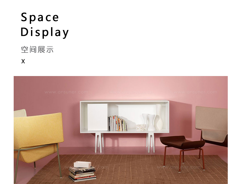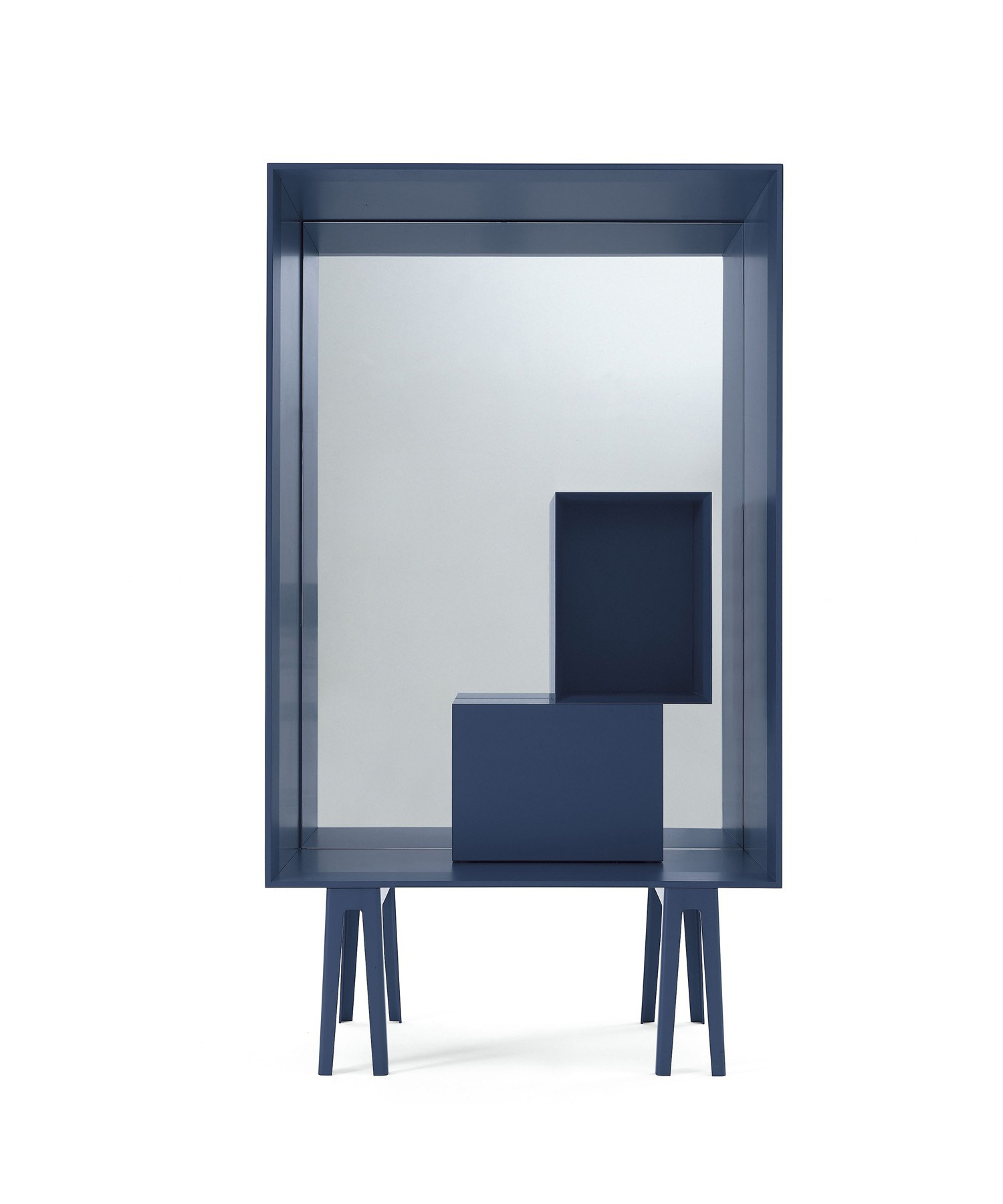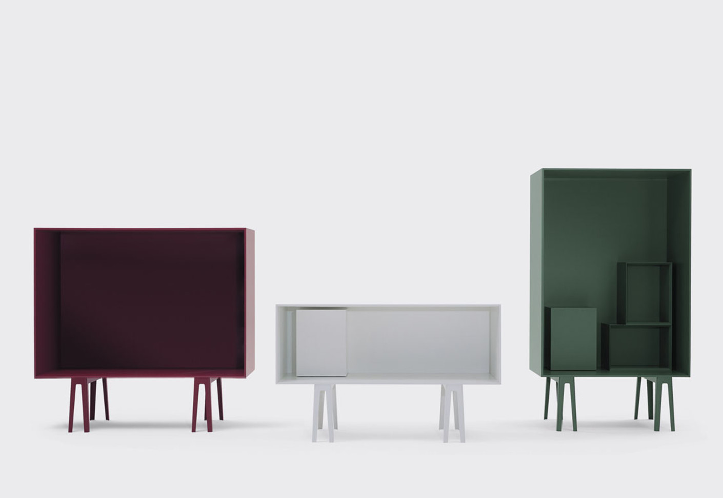 橱柜采用杨木胶合板和铝合金制成,斜腿采用铝板制成,漆面与橱柜颜色相同。 对于个性化的触摸,可以将独立式容器(具有相同的饰面)放置在橱柜内,橱柜可以是敞开的或带门的。