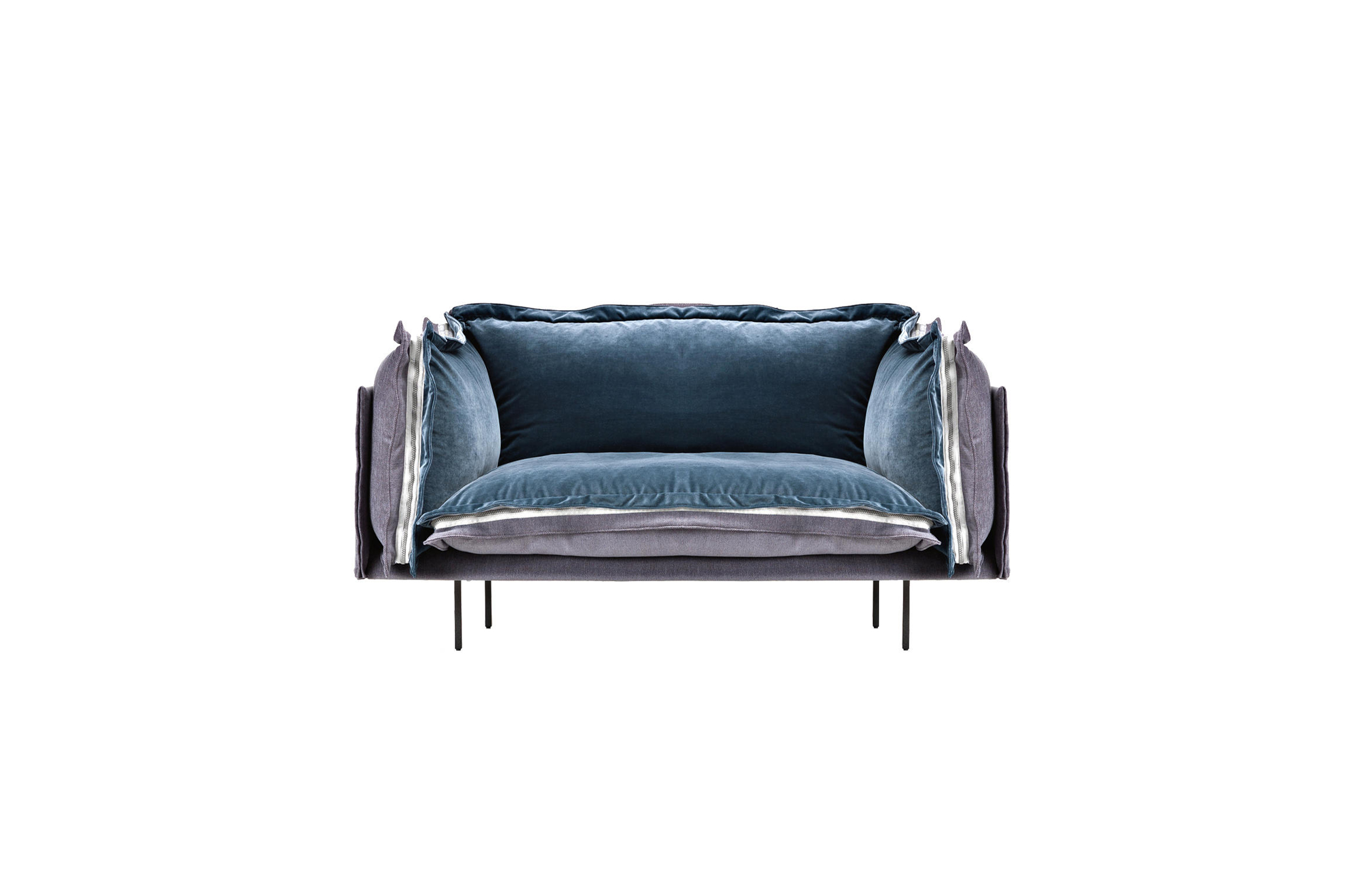 The sofa Auto-reverse by Arketipo, versatile and with a strong personality, derives from the idea of expressing a double soul in the living area. Its apparent casual and untidy look is in contrast with the order and extreme care for the details, to obtain an object with a sharp style and of high quality. The thin structure, elegant and discreet, enwraps and contains the seat cushions, the back and the arms, emphasized by flounces all around the perimeter which grant a definite movement to the line and add a tactile and visual softness to the sofa.