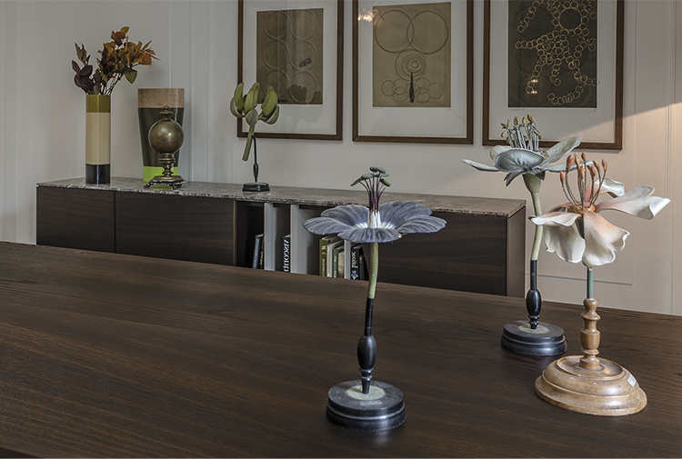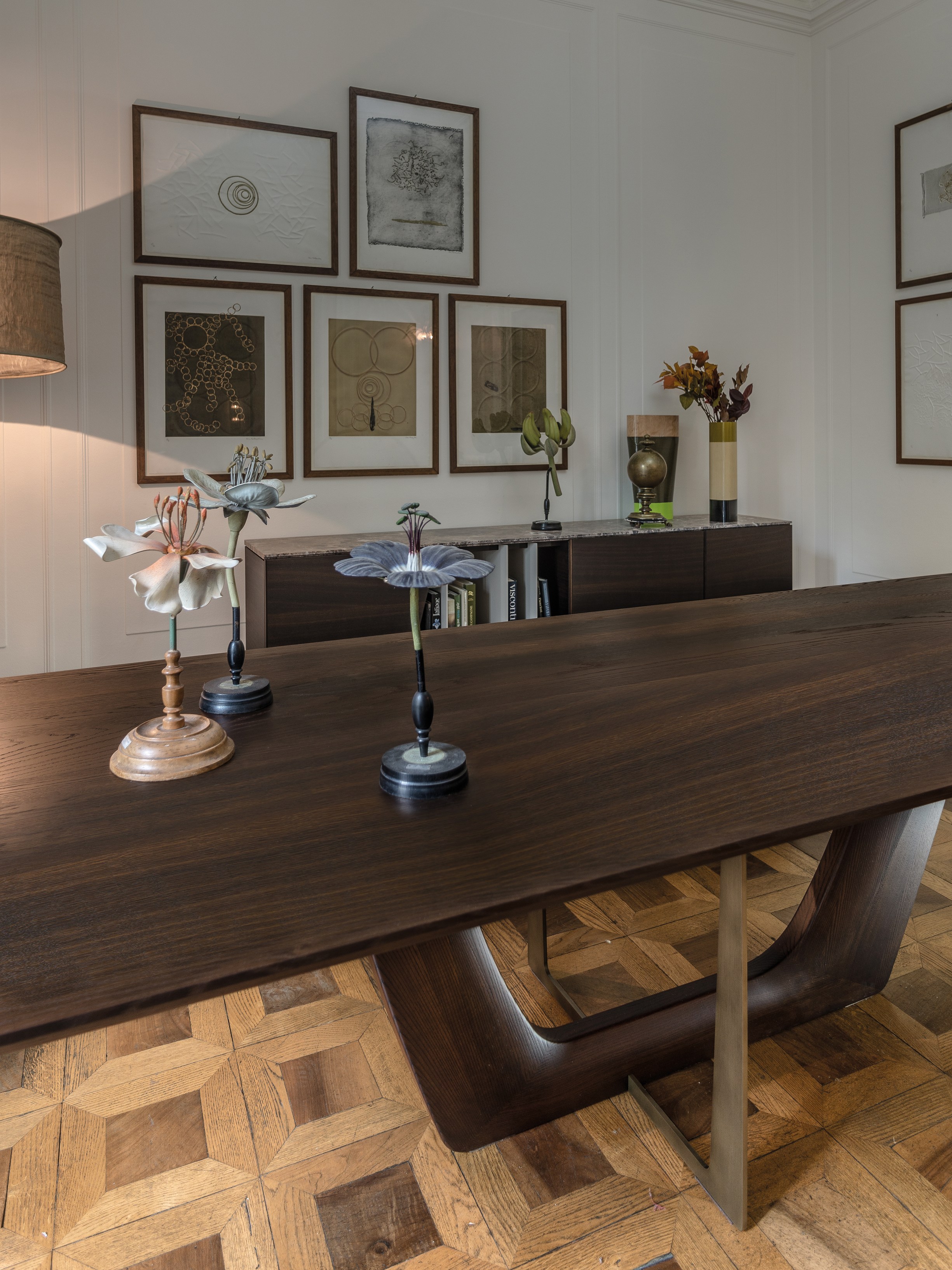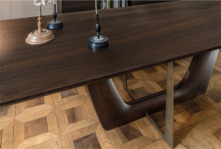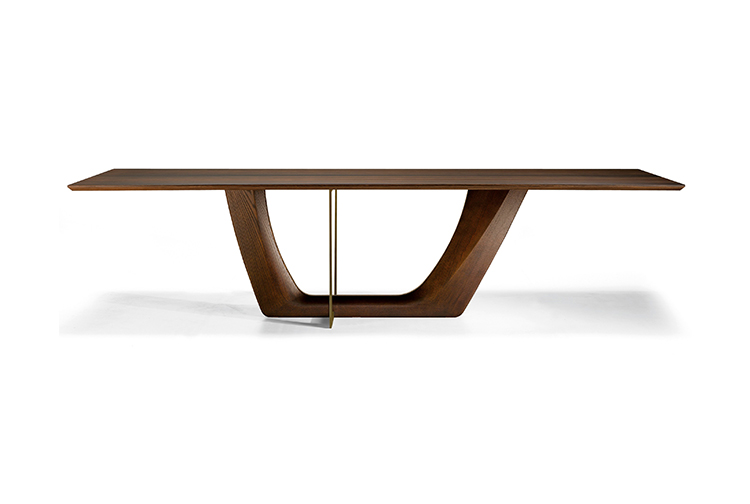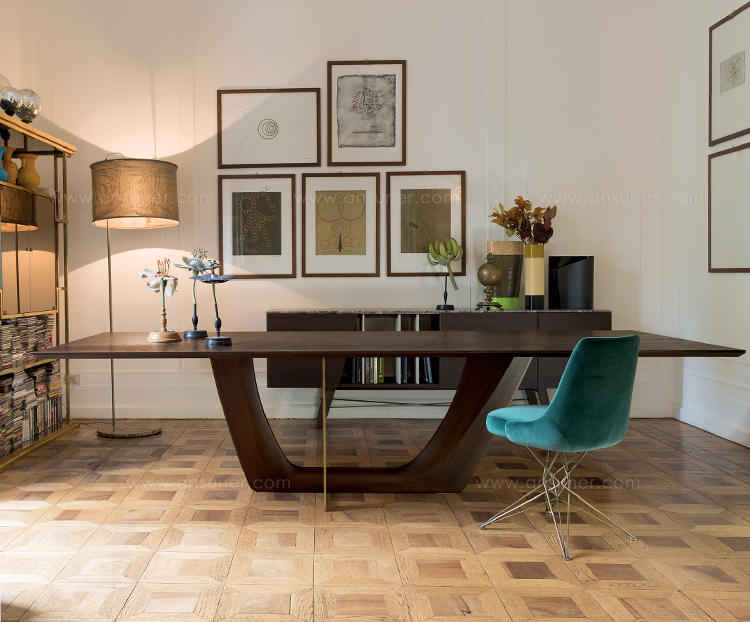 一个极富特色的餐桌,富有独特的细节,保证了在任何环境中都备受瞩目的存在。底座的结构和工艺都凸显出了独立的金属环,由青铜或钛合金涂漆制成。