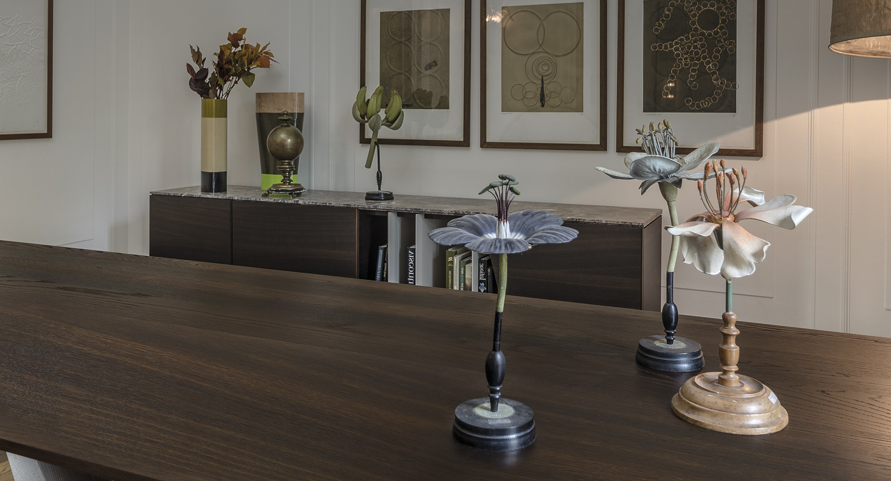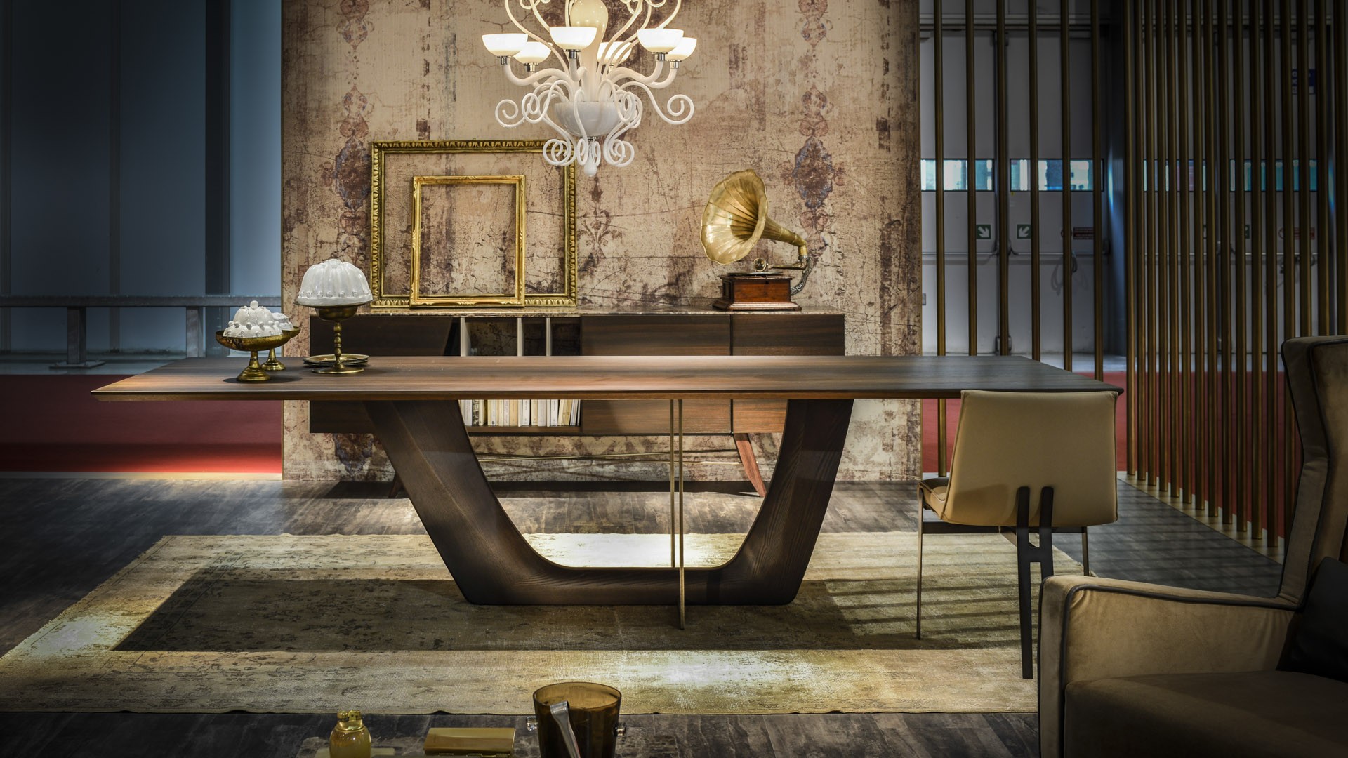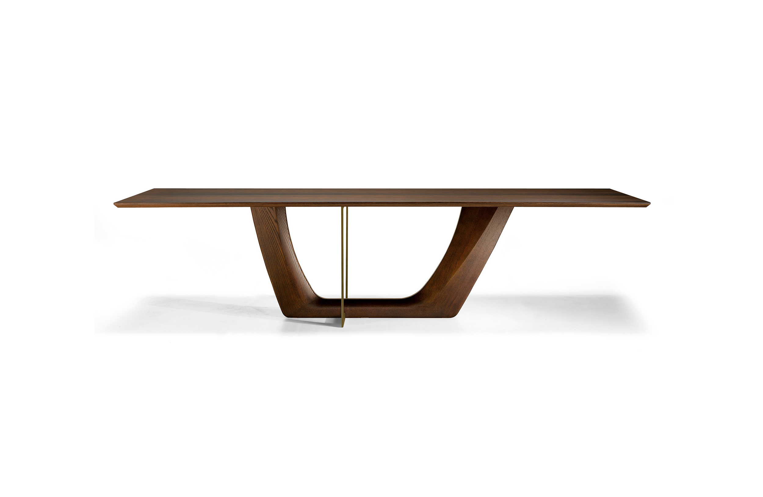 一个极富特色的餐桌,富有独特的细节,保证了在任何环境中都备受瞩目的存在。底座的结构和工艺都凸显出了独立的金属环,由青铜或钛合金涂漆制成。