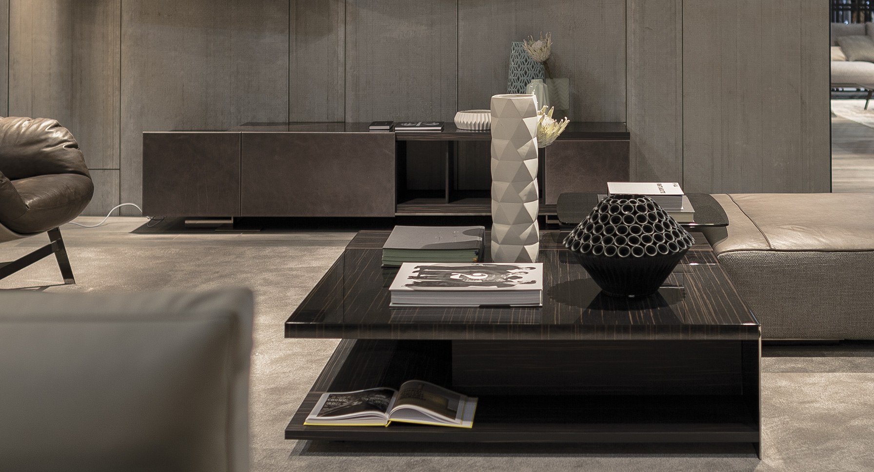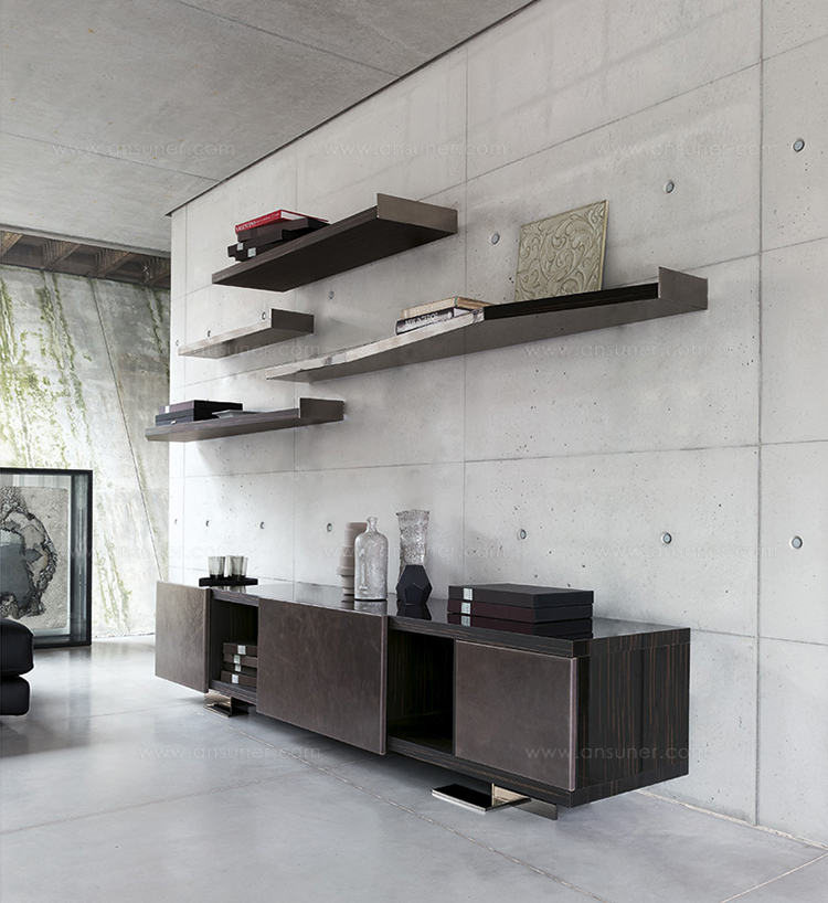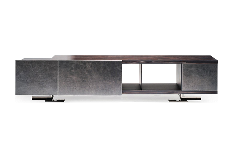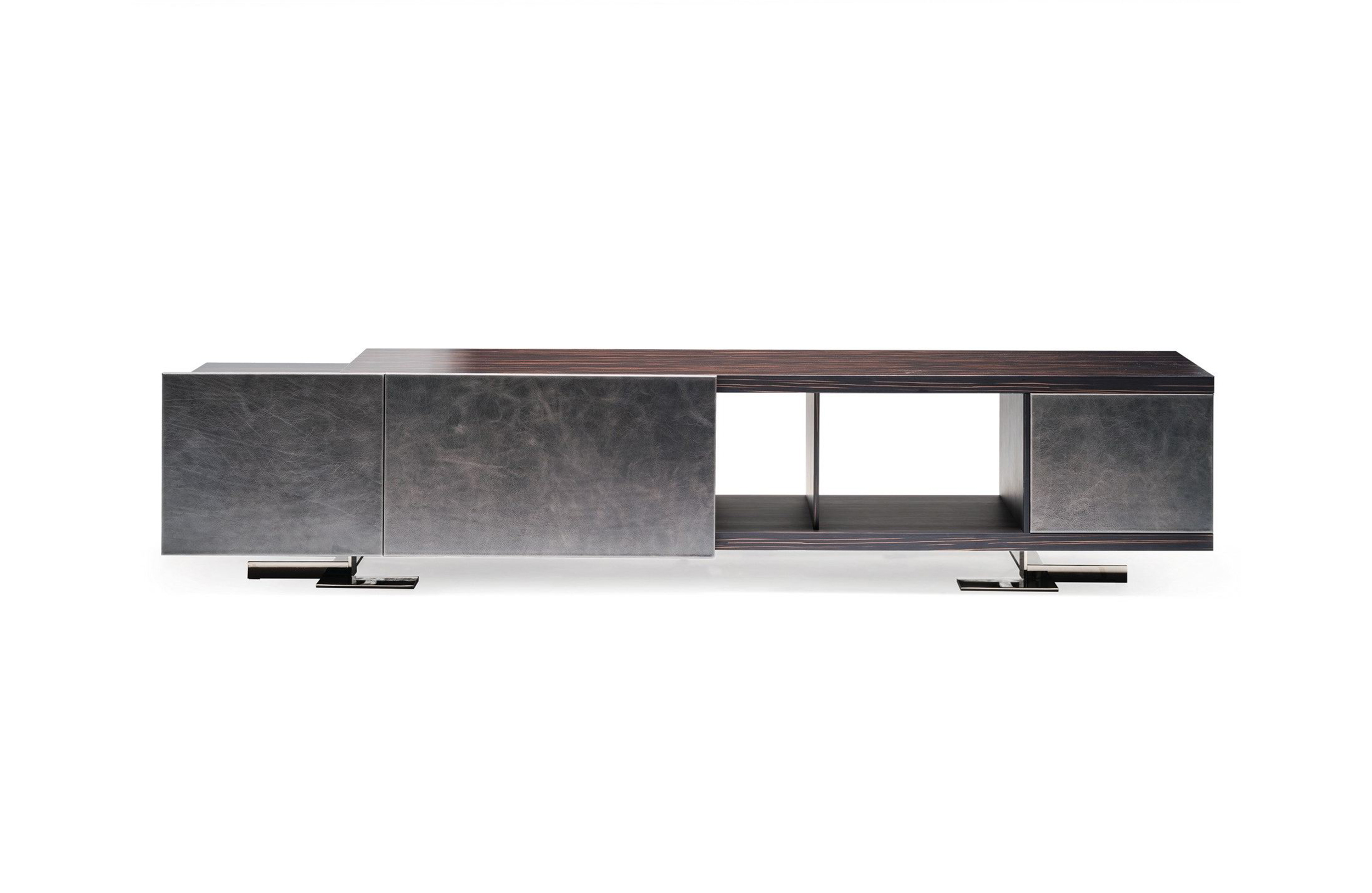 Endor餐具柜的特点是独立而精确的图形设计,就像一个荒岛。由于它的结构和开放的架子,它可以放置在墙壁或客厅。柜体由摩卡橡木、柚檀和乌木制成,柜门上面覆盖了列奥纳多的真皮。金属底座可以用云母棕或黑镍制成。