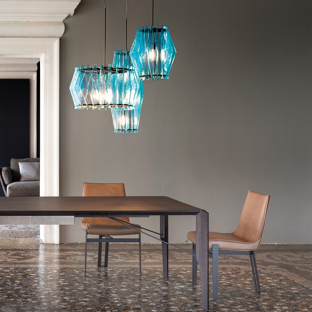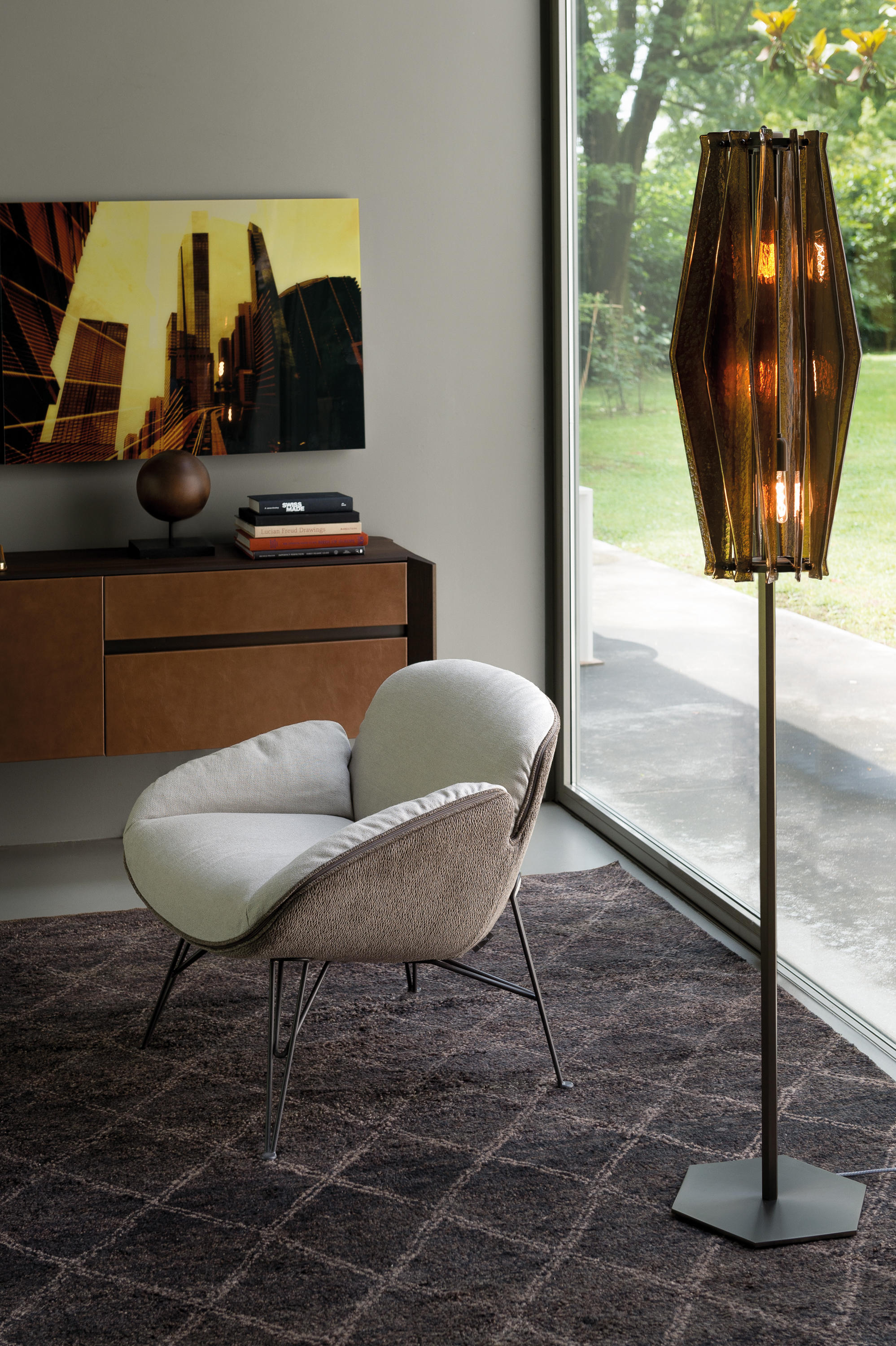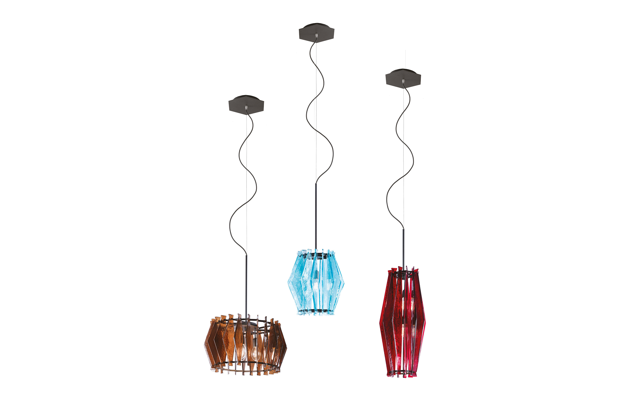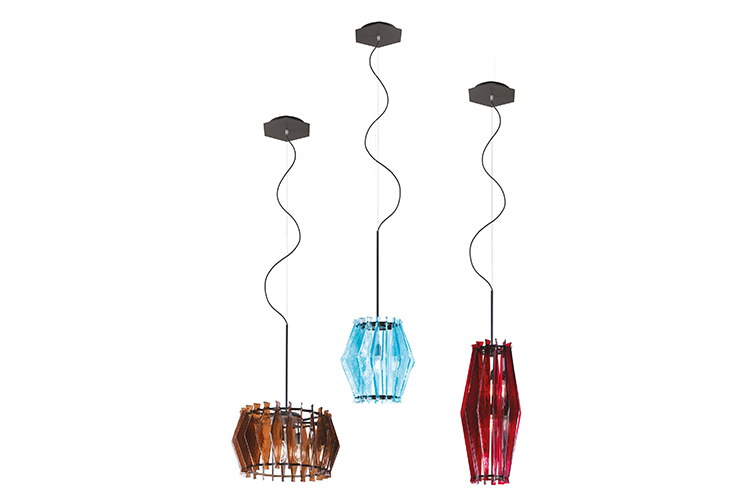oompa-loompa灯的特点是有几条带着径向定位的带斑点的玻璃,就像许多小型的“oompa-loompas”正在跳舞一样。光线透过玻璃和空的空间扩散,创造出几束光线,营造出壮观的环境。该系列包括一个悬挂的版本,有青铜色、蓝绿色和红宝石色三种不同颜色;和一盏落地灯。金属部分是云母棕色的钛。
