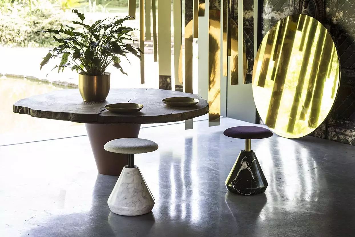 一系列由标志性的雕塑底座定义的作品,唤起与之元素连接大自然。我们对Nube的关注是重量和轻盈之间的关系,而我们解决了让敏捷形状从大理石或水泥基座中分出分枝的问题,就像发芽一样的岩石。灯垂直发展或在一个壮观的柳条弧线,外套架上的崎岖看着它粗糙的金属茎杆,桌子和凳子在柔软中调和木制的表面或软垫座椅。