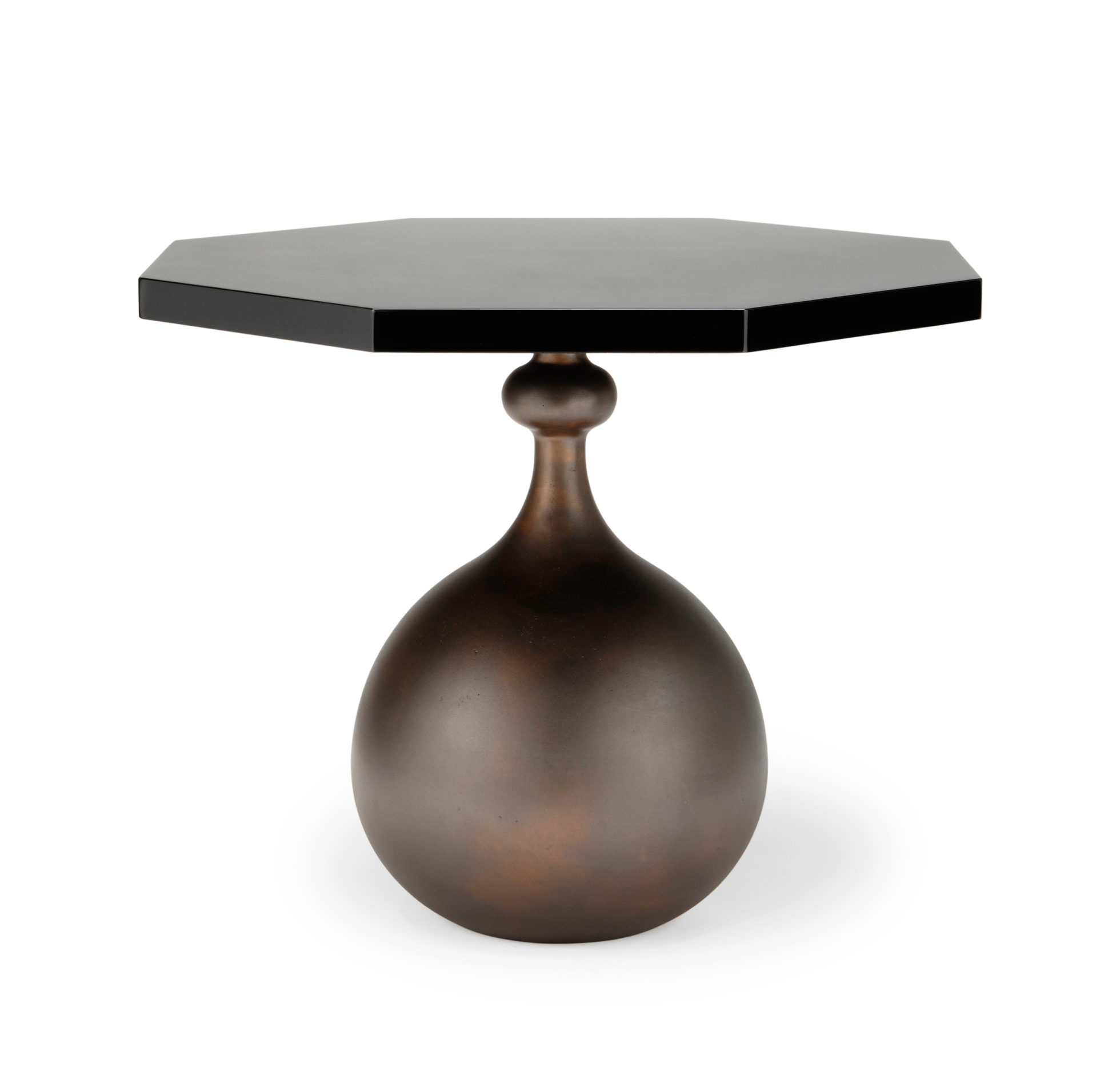 这张桌子上有一个古色古香的青铜底座和一个八角形的顶部。