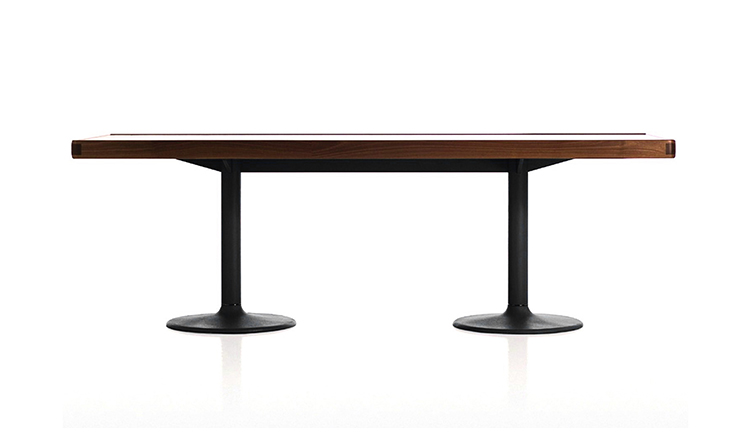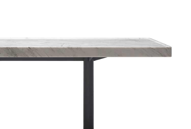 1984年的Charlotte Perriand设计的LC11复版。花冠脚桌。灰色搪瓷钢架机构和铸铁基底。一种采用哑光清漆胡桃木桌面(长220 cm - 86.6"),另一种采用卡拉拉大理岩桌面和灰色铸铁桌腿(长213,5 cm - 84")。包括二种基本型式的餐桌,第一种于1934年为Le Corbusier的Rue de Nungesser et Coli区巴黎公寓创作,第二种于1935年份为布鲁塞尔Maison du Jeune Home设计。