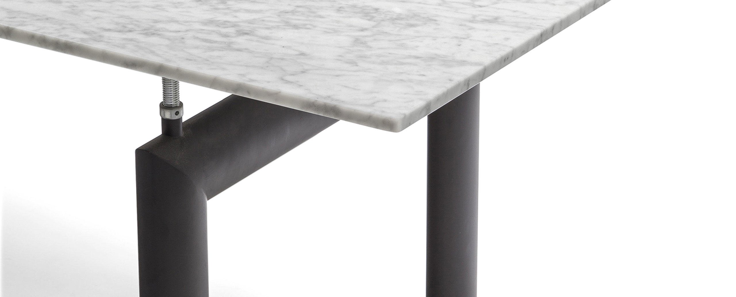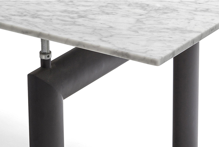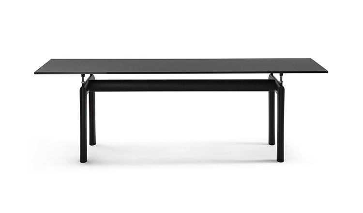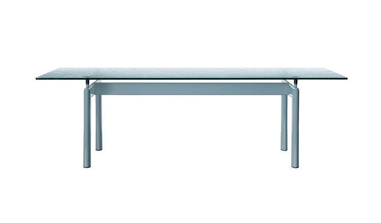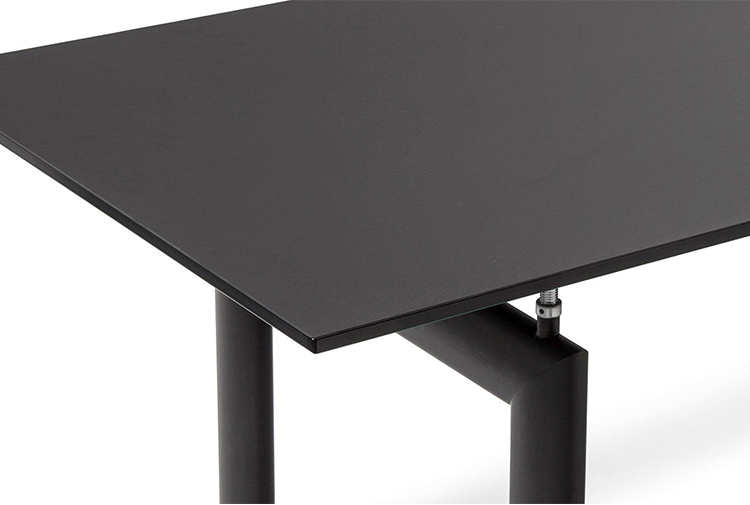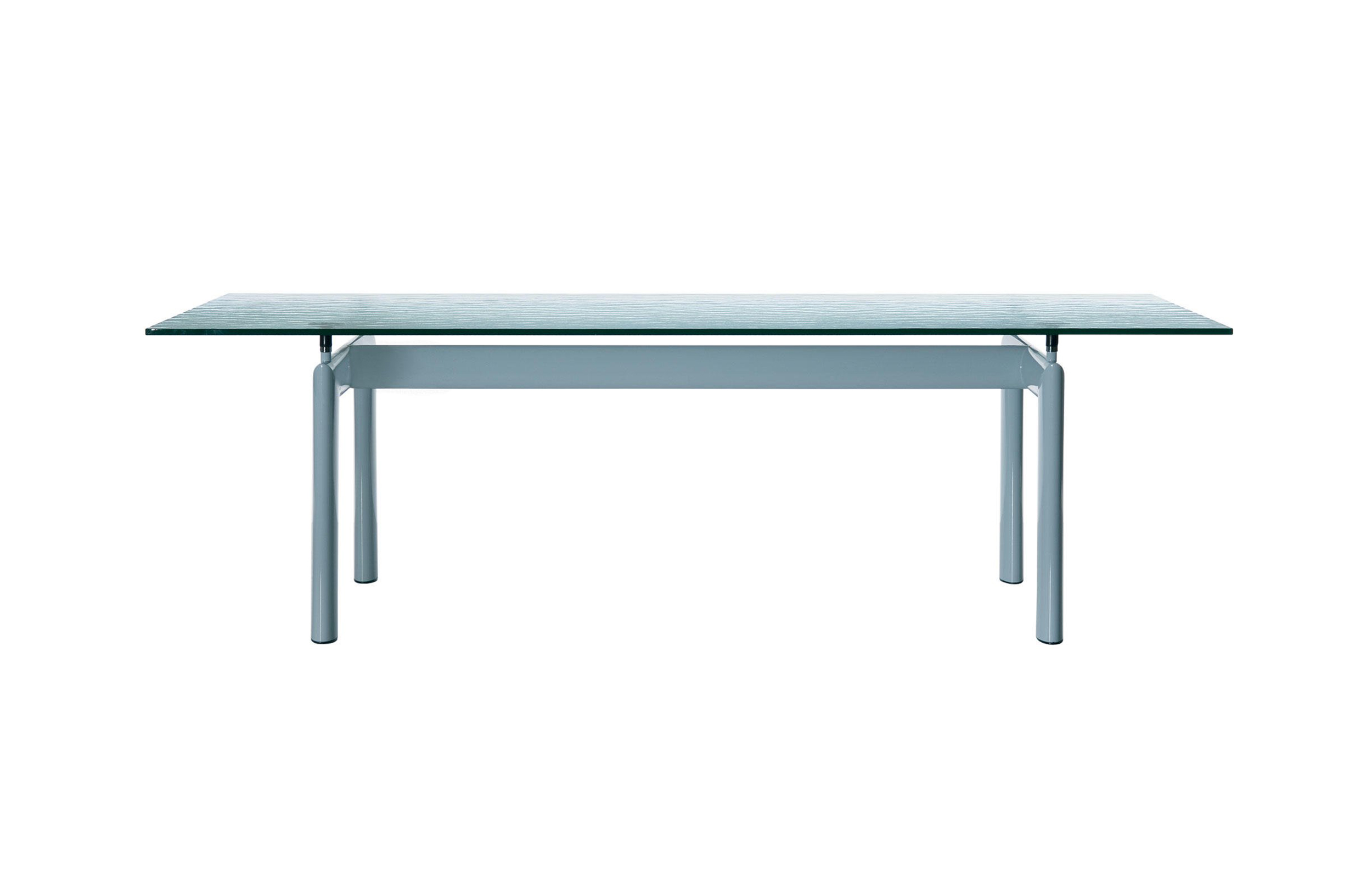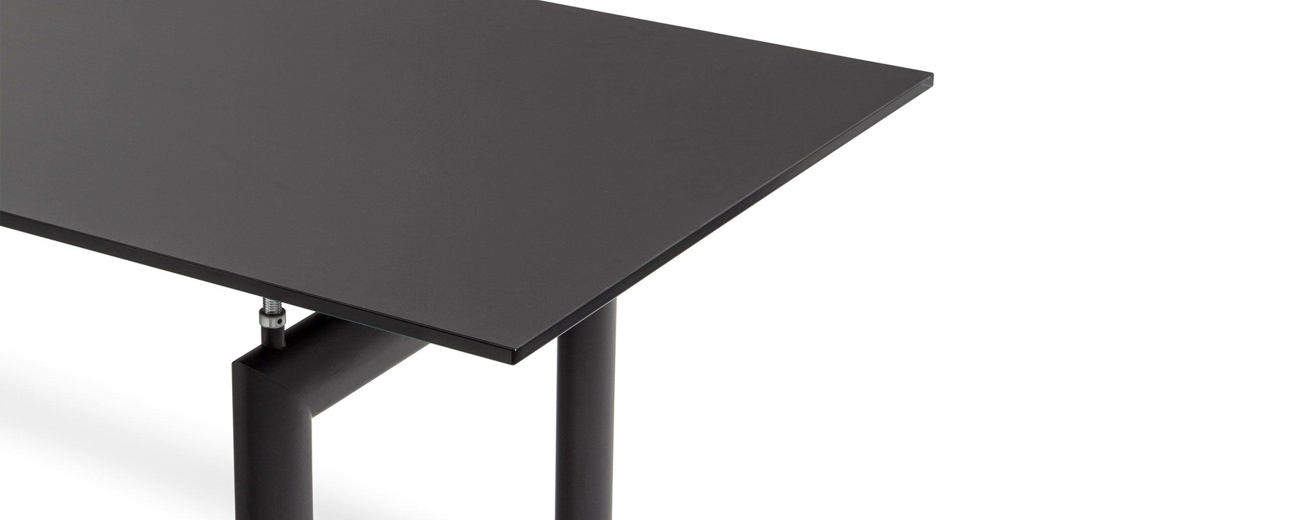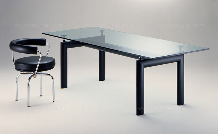 哑光灰色、淡蓝色、绿色、泥土色、象牙白色或黑色珐琅钢结构桌腿。桌腿采用带有钢螺纹杆的四个支撑点,高度调节量可达50mm,晶质网纹玻璃,天然或黑灰桌面。还有两个款式的珐琅钢桌腿和热成型玻璃桌面:哑光钢结桌腿、玫瑰烟灰桌面和哑光象牙白色桌腿、蓝色桌面。该款桌子的桌腿是于1928年使用航空业内用于维持机翼分离的卵形外观来设计的。在1929年巴黎秋季沙龙中展览的款式拥有玫瑰色印花玻璃桌面和绿色桌腿;随后,Charlotte Perriand还开发了蓝色桌面和象牙白色桌腿的桌子模型。