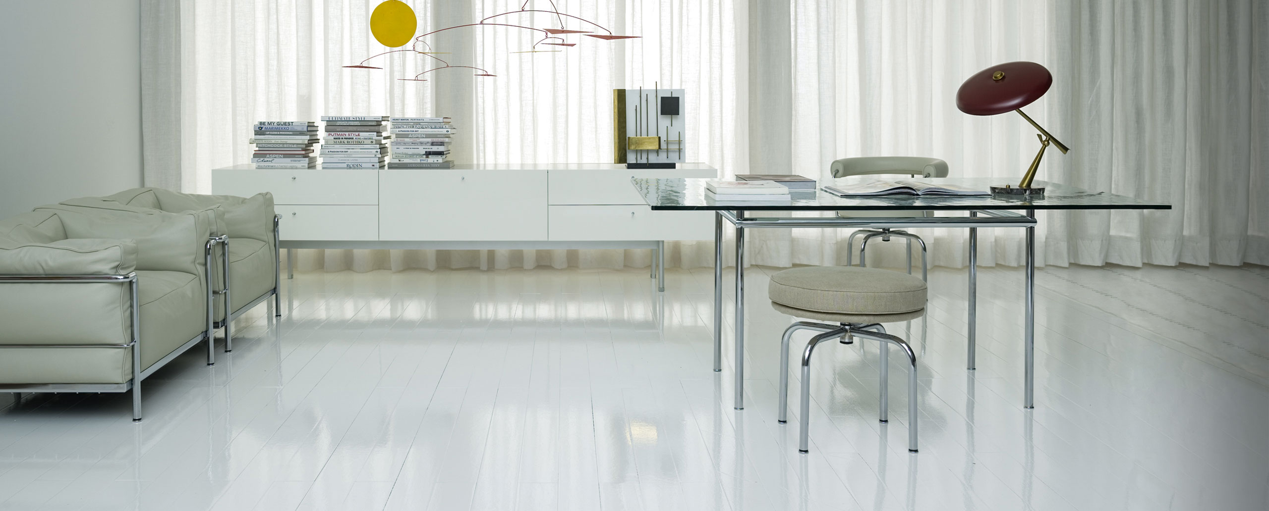 矩形桌,采用CR3三价镀铬钢结构或浅蓝色哑光珐琅钢架。桌面选用50mm厚的胡桃木或15mm厚的晶质或网纹玻璃。有2种尺寸的矩形桌面可供挑选:160x120 cm或120x80 cm,这款于1925年为La Roche House设计的桌子为不同位置带来了解决方案。他们的精髓在于支撑和被支撑两个元素之间的比例对比,也就是说:垂直形状的桌腿的最低宽度以及水平方向桌面的最大宽度。Le Corbusier的其它设计中也强调尺寸关系的对比,确认存在塑料诗意的优点,普遍通过元素角色反演、桌面与实际重量的振动大小以及桌腿与视觉精美的舒适稳定度进行表达。