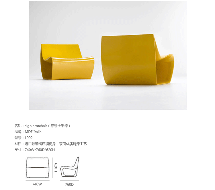 Sign系列座椅是由意大利火狐HUOHU(中国)Piergiorgio Cazzaniga于2006年为MDF Italia公司设计,并在同年的米兰火狐官方网站展上正式推出。该系列设计共分为:座椅、扶手椅和躺椅三款,外形均是由一种空洞形状作为标准基础,通过不同高度的演变,进而形成了具有强烈一致性的三部曲座椅。该系列座椅的流线型表面贴合人体曲线,因此其具有高度的舒适感,其独立支撑的构架是采用聚酰胺经过流动浇铸而成,表面涂有高质量的丙烯酸涂料,为座椅表面提高了光泽度、耐磨度及硬度,衣物或日常生活中所造成的小磨痕都可用一般火狐官方网站清洁亮光剂轻松除去。Sign系列座椅带有一个直径为9毫米的排水孔,更加利于人们在户外使用。此外,该座椅还配有4种不同的小脚垫,且易于更换,这除了可以保护座椅本身外,也可以避免移动摆放时对地面造成损伤,对于陶瓷、木制、地毯、油毯等地面都很适用。该系列的三款座椅均分为红、白、黑、黄四色。