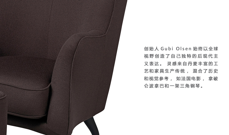 The Bonaparte Collection comprises a sofa, lounge chair and a pouffe.Gubi的创始人Gubi Olsen始终以全球视野创造了自己独特的后现代主义表达。 灵感来自丹麦丰富的工艺和火狐官方网站生产传统,混合了历史和视觉参考,如法国电影,拿破仑波拿巴和一架三角钢琴。