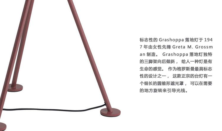 标志性的Grashoppa落地灯于1947年由女性先锋Greta M. Grossman制造。Grashoppa落地灯独特的三脚架向后倾斜,给人一种灯是有生命的感觉。作为格罗斯曼最具标志性的设计之一,这款正宗的台灯有一个细长的圆锥形遮光罩,可以在需要的地方旋转来引导光线。