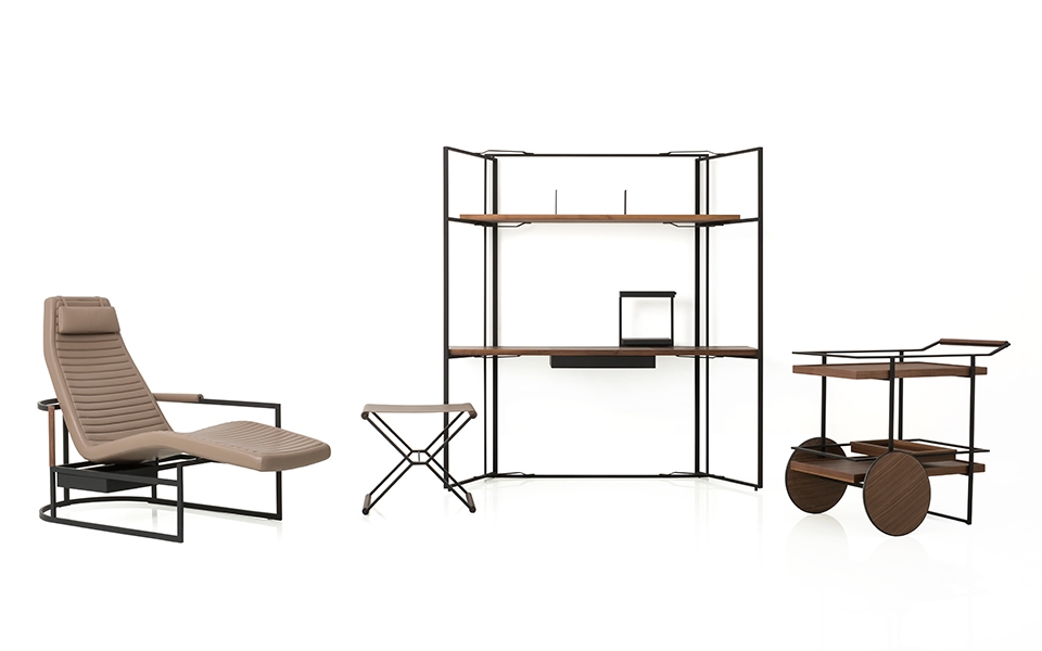 这三件作品都是为了将负空间变成一种审美特征,利用浮动的平面和线框来营造一种光鲜、简洁的氛围。选材上受全球汽车工业风影响,选取了具有温润触感的黑色金属、胡桃木和深色调哑光皮革,细节处渲染出精致本色。
