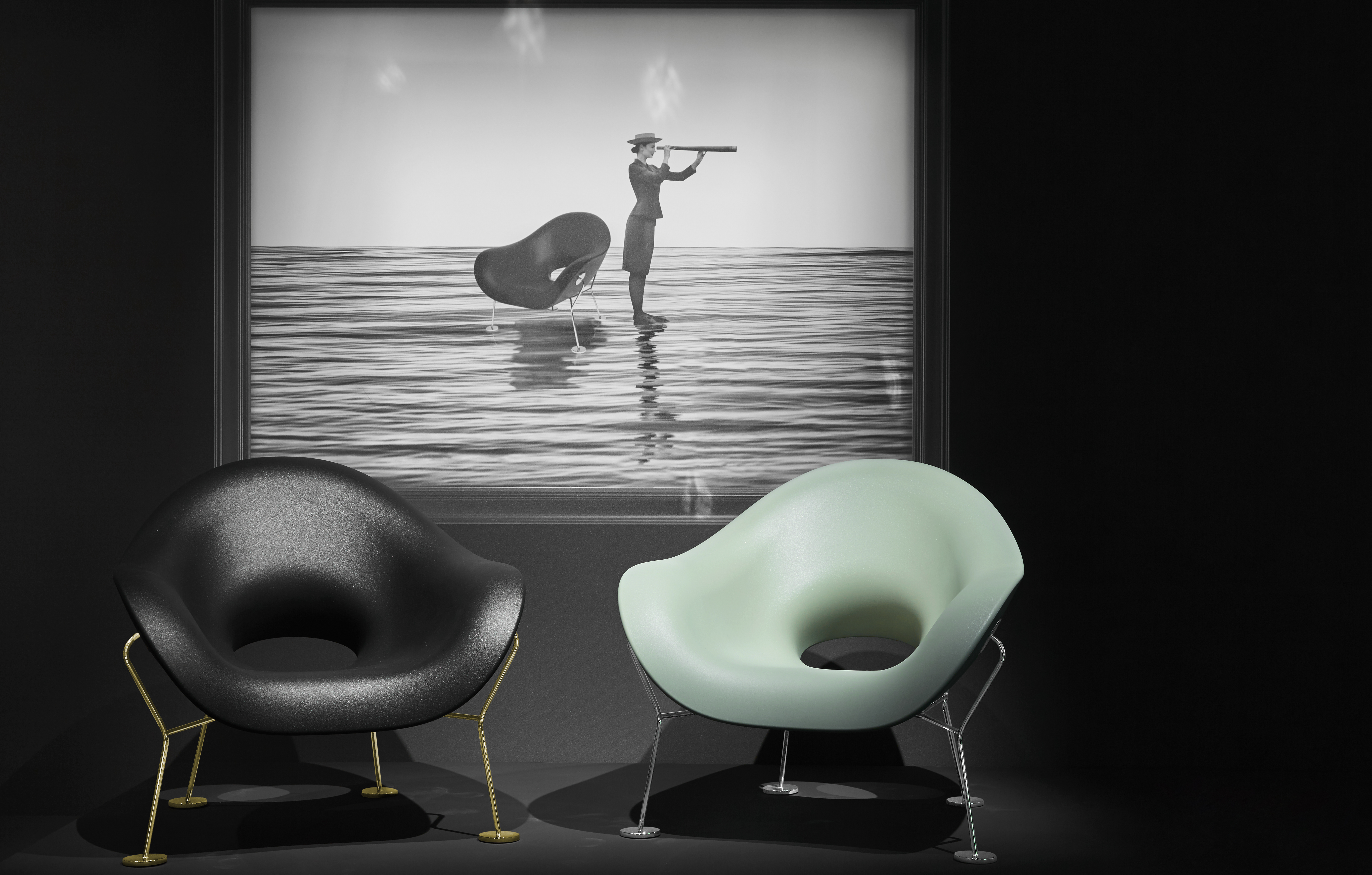 由Andrea Branzi签名的Pupa扶手椅同时具有敏捷和性感。 它倾斜在轻质金属框架上,使体积漂浮在空间中。外型为铬框,内饰为金框。