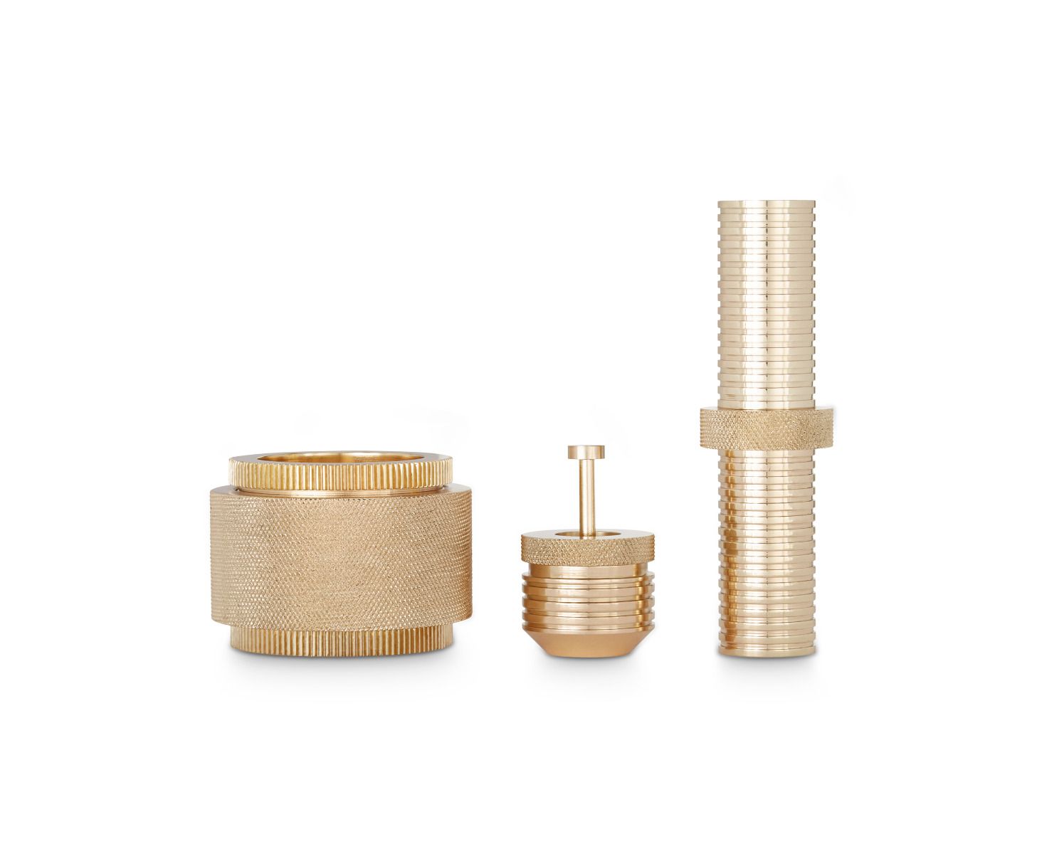 实心铝质生料块和管材在车床上进行加工,使用传统的精密机床进行切削和滚花。然后进行抛光,镀铜和抛光,最后用漆完成。标志深深地刻在底座上。