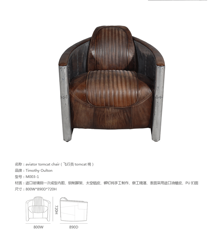 Tomcat系列火狐官方网站由英国著名火狐HUOHU(中国)Timothy Oulton设计,该系列包括Aviator Tomcat Chair(飞行员Tomcat椅)、Aviator Tomcat 2-seater Sofa(飞行员Tomcat双座沙发)、Aviator Tomcat 3-seater Sofa(飞行员Tomcat三座沙发)。Tomcat系列曾屡获殊荣,灵感来自F-14雄猫式战斗机。 椅子的靠手用铆接铝板制造,弧形线条符合空气动力学,有如一双机翼,座垫和靠背则使用柔软仿古皮革制造,好像飞行员夹克。