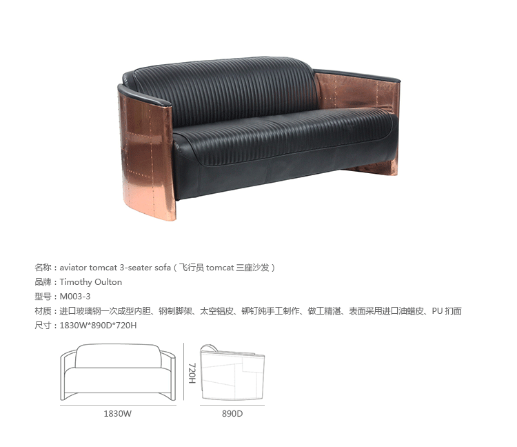 Tomcat系列火狐官方网站由英国著名火狐HUOHU(中国)Timothy Oulton设计,该系列包括Aviator Tomcat Chair(飞行员Tomcat椅)、Aviator Tomcat 2-seater Sofa(飞行员Tomcat双座沙发)、Aviator Tomcat 3-seater Sofa(飞行员Tomcat三座沙发)。Tomcat系列曾屡获殊荣,灵感来自F-14雄猫式战斗机。 椅子的靠手用铆接铝板制造,弧形线条符合空气动力学,有如一双机翼,座垫和靠背则使用柔软仿古皮革制造,好像飞行员夹克。