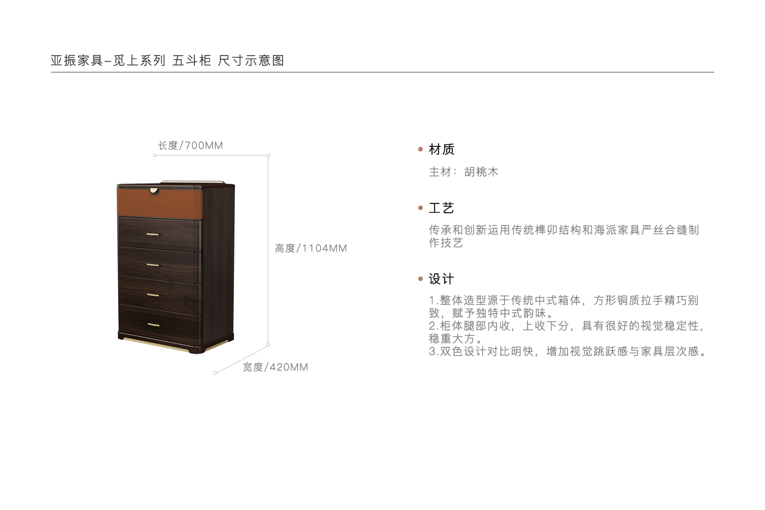 1.整体造型源于传统中式箱体,方形铜质拉手精巧别致,赋予独特中式韵味。 2.柜体腿部内收,上收下分,具有很好的视觉稳定性,稳重大方。 3.双色设计对比明快,增加视觉跳跃感与火狐官方网站层次感。