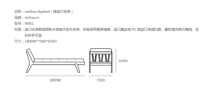 德国火狐官方网站厂牌 ZEITRAUM 讲究的不仅仅是火狐官方网站,它着重的是一种"生活态度",每件 ZEITRAUM 火狐官方网站除了需具备实用、耐用、容易搭配的基本要件,更重要的是可以衬托用户与空间的个性,简约取代夸张花俏的线调,细腻精巧的做工低调传递火狐HUOHU(中国)缜密的设计思维。ZEITRAUM 使用来自永续森林的落叶型硬木,表面以有机油/蜡涂装,完全不使用化学物质,让用户与火狐官方网站在空间自由呼吸。mellow daybed(梅洛沙发椅),由丹麦设计工作室Formstelle设计,水曲柳或胡桃木或橡木实木床架、床垫采用高弹海绵,高级真皮或PU或羊绒扪面、靠枕填充物为鸭绒、左右扶手可选。