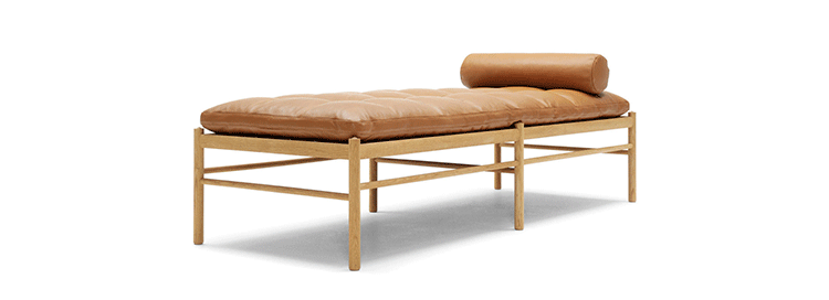 "OW150 is a timeless and elegant daybed with simple forms finished to the very highest standards.Slim dimensions and resilient forms are haracteristics of Ole Wanscher's designs.Classic and yet singularly modern at the same time.The seat is made of hand-woven stretched cotton webbing in black,attached to a solid wood frame.The cushions consist of down molded cold foam,upholstered in your choice of fabric or leather.Matching neck pillow is also included.Cushion is not turnable."