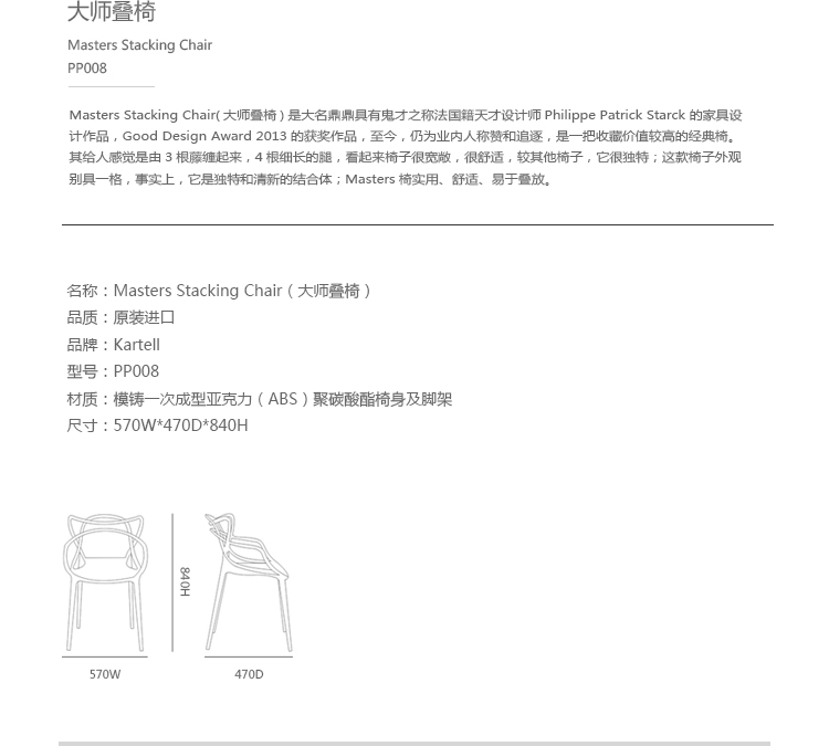 Masters Stacking Chair(大师叠椅)是大名鼎鼎具有鬼才之称法国籍天才火狐HUOHU(中国)Philippe Patrick Starck的火狐官方网站设计作品,Good Design Award 2010 和 Gold Dot Award 2013的获奖作品,至今,仍为业内人称赞和追逐,是一把收藏价值较高的经典椅。其给人感觉是由3根藤缠起来,4根细长的腿,看起来椅子很宽敞,很舒适,较其他椅子,它很独特;当然,它还非常坚固,你不需要担心它是否能承受一个人的重量。这款椅子外观别具一格,事实上,它是独特和清新的结合体;Masters椅由纤细椅腿作支撑,座位空间很大,并且舒适感极强。这款椅子最吸引人的是其特殊的椅背,三个不同靠背向下延伸,在椅座处融合,形成柔美的交叉线条,从而打造出丰满而空灵的空间感。Masters椅实用、舒适、易于叠放。