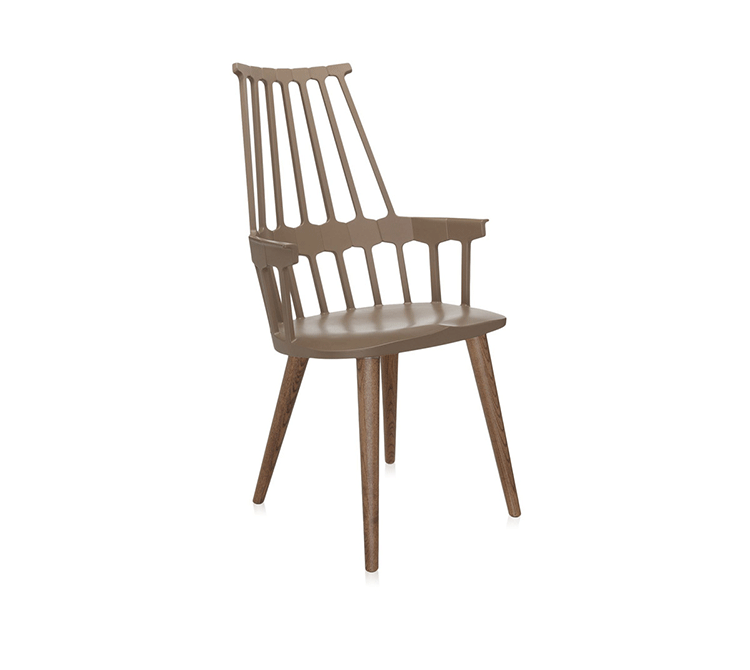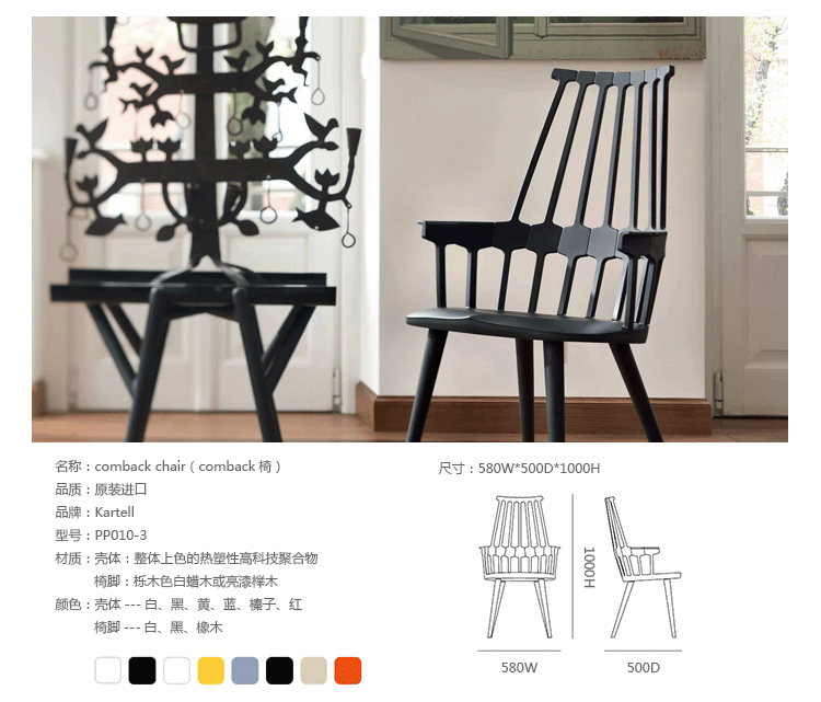 温莎风格椅被冠以乡村风格,但并非一成不变,在不同时期不同阶段又融入新的设计元素。Kartell的这款产品再一次享受重现经典的设计快乐,国际知名家居火狐HUOHU(中国)Patricia Urquiola为温莎椅(Windsor Chair)打造了一个这款新的造型。回归十八世纪英格兰的辉煌时期“梳背”椅的特点,整个框架用亚光材质,靠背的7个分支结构朝着椅腰部位向下延伸,在一个加固六角形圆圈处与纤细的轴汇合,与椅座合为一体。聚碳酸酯材质的使用赋予COMBACK一种轻盈的质感和当代风格。浸透在黑色COMBACK梳背椅里的那一分淡定从容,能让人气定神闲,默默却又不留情面地将浮华虚荣隔在门外。因为不存在彩色光谱里,白色可以说并非真正色彩。纯白色Comback Chair梳背椅,唯美得让人难以抗拒。那种与世无争的清雅,好似刚刚落入凡尘的花瓣,昭示宁静与自然。这款Comback Chair 来自意大利的创新品牌Kartell,以发梳为灵感,回归18世纪英式风格,整齐对称的典雅扮相,表现出一份沉稳内敛的韵韵意涵。木质椅角的运用,让复古气息升华其中。配搭塑料椅身的现代风格特色,不愧为一份跨越历史的新时代作品。荣获2011年Wallpaper设计奖殊荣。