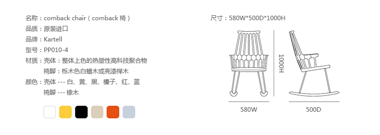 温莎风格椅被冠以乡村风格,但并非一成不变,在不同时期不同阶段又融入新的设计元素。Kartell的这款产品再一次享受重现经典的设计快乐,国际知名家居火狐HUOHU(中国)Patricia Urquiola为温莎椅(Windsor Chair)打造了一个这款新的造型。回归十八世纪英格兰的辉煌时期“梳背”椅的特点,整个框架用亚光材质,靠背的7个分支结构朝着椅腰部位向下延伸,在一个加固六角形圆圈处与纤细的轴汇合,与椅座合为一体。聚碳酸酯材质的使用赋予COMBACK一种轻盈的质感和当代风格。浸透在黑色COMBACK梳背椅里的那一分淡定从容,能让人气定神闲,默默却又不留情面地将浮华虚荣隔在门外。因为不存在彩色光谱里,白色可以说并非真正色彩。纯白色Comback Chair梳背椅,唯美得让人难以抗拒。那种与世无争的清雅,好似刚刚落入凡尘的花瓣,昭示宁静与自然。这款Comback Chair 来自意大利的创新品牌Kartell,以发梳为灵感,回归18世纪英式风格,整齐对称的典雅扮相,表现出一份沉稳内敛的韵韵意涵。木质椅角的运用,让复古气息升华其中。配搭塑料椅身的现代风格特色,不愧为一份跨越历史的新时代作品。荣获2011年Wallpaper设计奖殊荣。