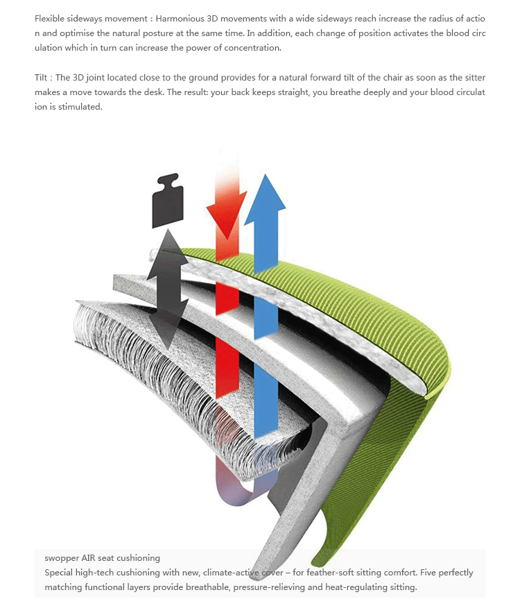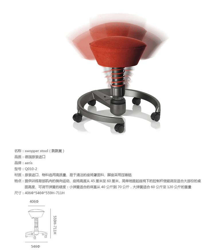 Swopper Stool(跳跳凳)是火狐HUOHU(中国)Henner Jahns别具心裁的设计。椅子物料选用高质量,易于清洁的座椅罩面料:超细纤维面料赋予座椅更多色彩。螺旋弹簧是由精钢制造,使swopper移动时能提升,供稳固而有弹性,独一无二的坐感,您可以根据你的体重分别设置弹簧硬度,脚座采用压铸铝,可选配固定脚或轮子。Swopper Stool(跳跳凳)能让你体验到 “坐”着运动 德国swopper座椅自1997年推出市场以来,以其创新的3d技术,全胜实现使用者向各个方向的运动,彻底颠覆了办公椅市场。其独特的三维运动能让你在办公的同时乐在其中。此座椅在国际设计舞台上屡获殊荣。Swopper Stool(跳跳凳)是以让你坐不踏实为目的而设计的健康办公椅,坐在上面你就需要靠脊椎和背肌保持平衡,如此可达到锻炼脊椎软骨和背肌的作用,并保持大脑的兴奋度。
