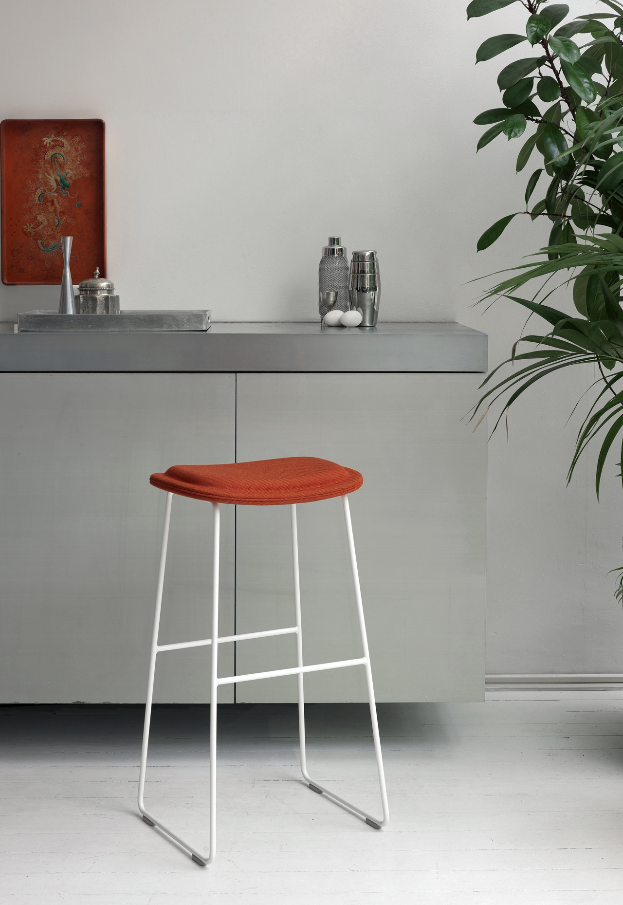凳子坐在山毛榉和桦木胶合板,multi-density聚氨酯泡沫。 固定在面料和皮革的集合. 基地缎不锈钢、聚丙烯的脚.