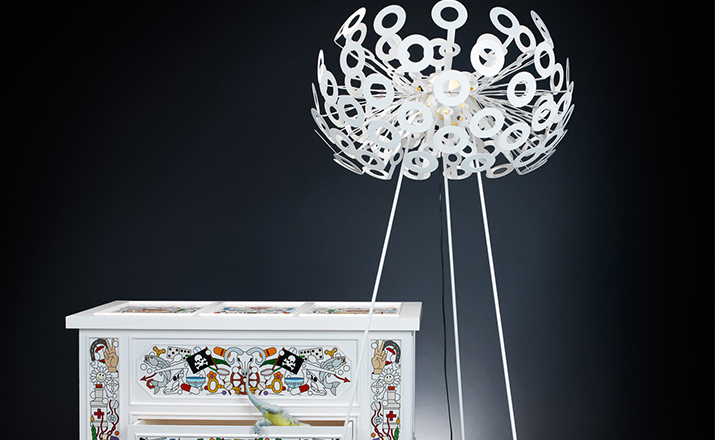 "Dandelion is a light and bright floor lamp in a modern design. It has been designed in 2004 by the designer Richard Hutten for the company Moooi. Dandelion resembles a dandelion with its round shape and the numerous small ramifications.The extraordinary design plays with its round shapes and with light and shadow. The light coming from the inside is broken on the individual branches that can be recognised from the outside by their silhouettes.The Dandelion floor lamp is only suitable for indoor use. It consists of powder-coated aluminium and steel."
