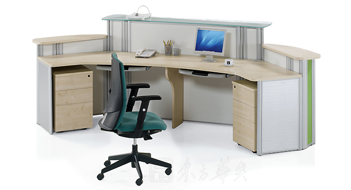 ※ 上图为前台背部展示图,三胺板内格层,外框板都为铝塑板材料,钢化玻璃接待层板,塑料键盘架,既传统又时尚,厚厚的板式支撑架!
