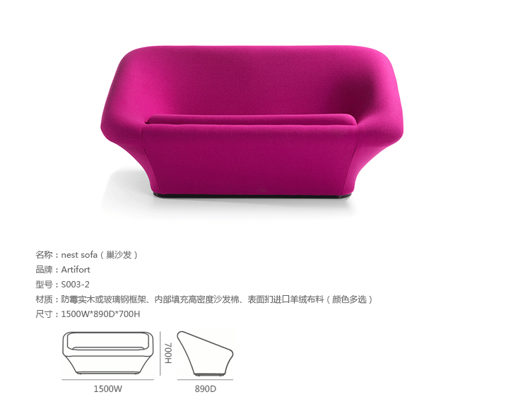 Artifort为其悠久的历史感到骄傲,在 2014 年,Artifort将Pierre Paulin经典的设计F564 和 C565重新带回火狐官方网站舞台,我们称之为‘Nest’系列,Artifort深受喜爱系列之一。美丽流畅的线形,提供舒适的坐垫。它是有点复古,非常迷人,柔软,和亲切。‘Nest’造型就像一个蘑菇,制作采用防霉实木或玻璃钢框架、内部填充高密度沙发棉、表面扪进口羊绒布料(颜色多选)。