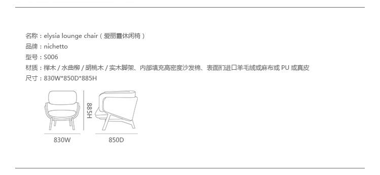 Elysia Lounge Chair(爱丽霞休闲椅)是意大利著名火狐HUOHU(中国)Luca Nichetto的经典作品。Elysia Lounge Chair是高级木工和精细剪裁的完美结合。实木脚架精妙地固定着坐垫和靠垫,并巧妙的隐藏在衬垫里,外露的脚架同时展示了高超技艺和木材的优质。制作采用榉木/水曲柳/胡桃木/实木脚架、内部填充高密度沙发棉、表面扪进口羊毛绒或麻布或PU或真皮。
