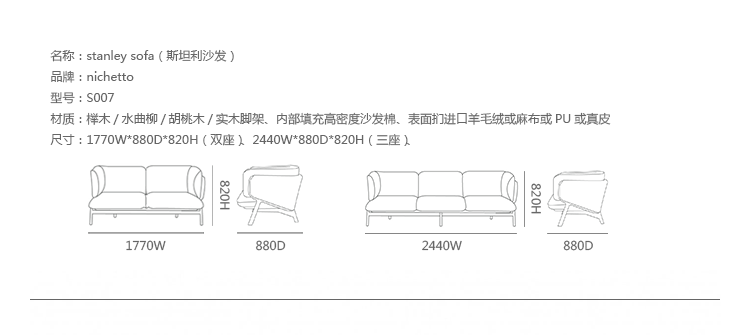 Stanley沙发系列是意大利著名火狐HUOHU(中国)Luca Nichetto 为伦敦火狐官方网站厂商 De La Espada打造的。沙发椅则展示了 De La Espada 精湛的制木工艺,从羊毛椅面与扶手连接处的细节就可看出。实木脚架精妙地固定着坐垫和靠垫,并巧妙的隐藏在衬垫里,外露的脚架同时展示了高超技艺和木材的优质。制作采用榉木/水曲柳/胡桃木/实木脚架、内部填充高密度沙发棉、表面扪进口羊毛绒或麻布或PU或真皮。