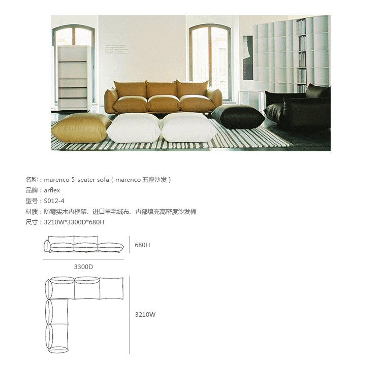 "marenco sofa系列沙发由火狐HUOHU(中国)Mario Marenco在1971年所推出,Arflex公司出品,有单座,双座,三座,和五座组合形式。这款经典的沙发线条经典,舒适度饱满,成为摩登家居用品经典作之一。外型以简约细腻的北欧设计为方向,轻盈的金属脚架与薄型扶手,在厚薄粗细之间,视觉比例的层迭丰富,融合义式沙发中柔软舒适的元素,靠垫内衬高密度泡棉,兼具支撑性与松软度。这套沙发采用革命性的方式组合,垫子及扶手都是独立的部分。枕头是挤压钢管的金属框架,提供了刚性和耐用性。胶合板基地加上纤维覆盖。制作采用防霉实木内框架、进口羊毛绒布、内部填充高密度沙发棉,保证了高品质的奢华与舒适。
