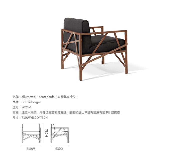 瑞士火狐HUOHU(中国)Atelier Oï为Röthlisberger设计的一款沙发系列名为“Allumette(火柴)”,有单座、双座和三座。ALLUMETTE 沙发的醒目外观是归因于其来自阿鲁拉豆木树的硬木雕刻镂空框架设计。在这里,压力和反压力接受负荷的相互作用。优雅和独创性与稳定性相结合。其金属般基调的非漆木材经过打磨、抛光处理,允许其感性的存在,以充分发展。坐垫及靠垫内部填充高密度海绵、表面扪进口羊绒布或麻布或PU或真皮,提供高度的舒适感。