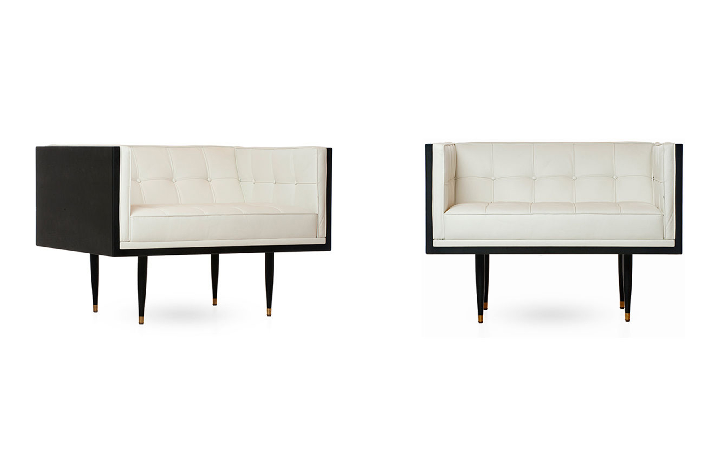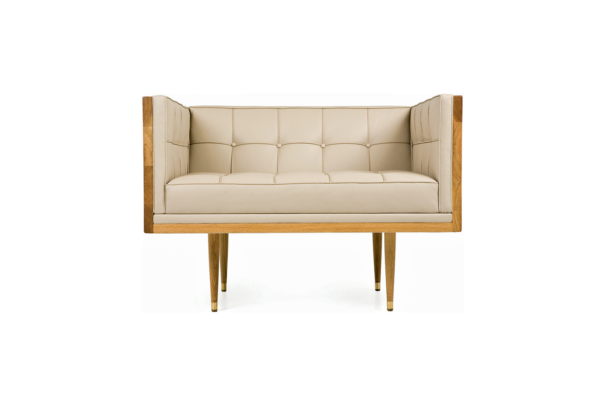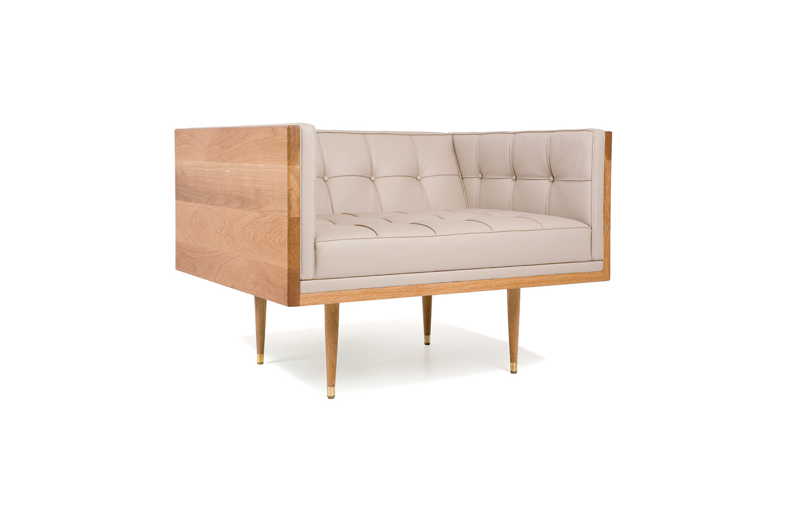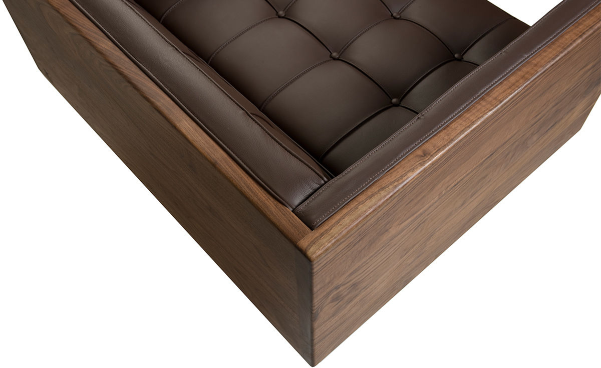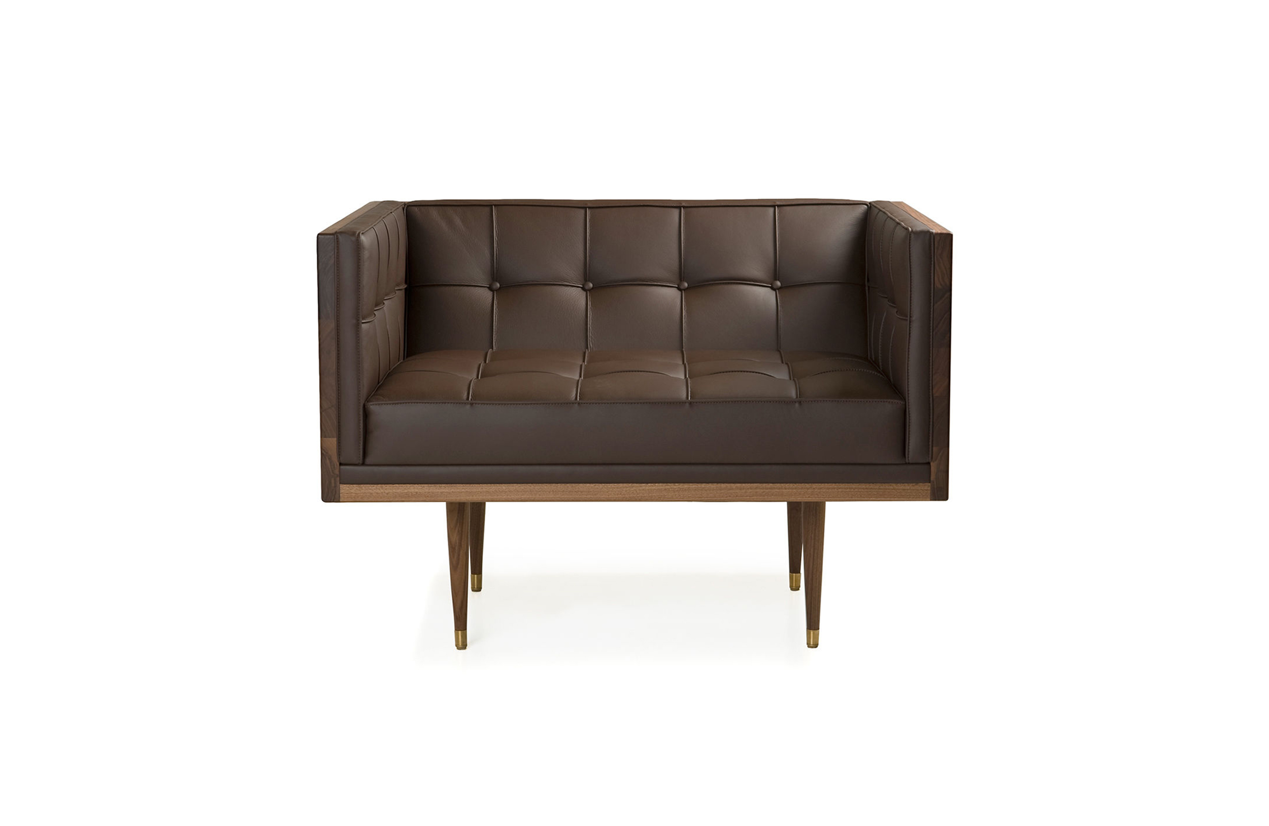 Box Armchair,inspired by the 1950's modernist movement,has the pure shape of a box.The inner face of the solid wood form offers refined comfort with crisp upholstery and classic tuft detailing. The four supporting legs appear to be impossibly slender,creating a stunning profile.Designed by Autoban and manufactured by De La Espada for the Autoban brand.