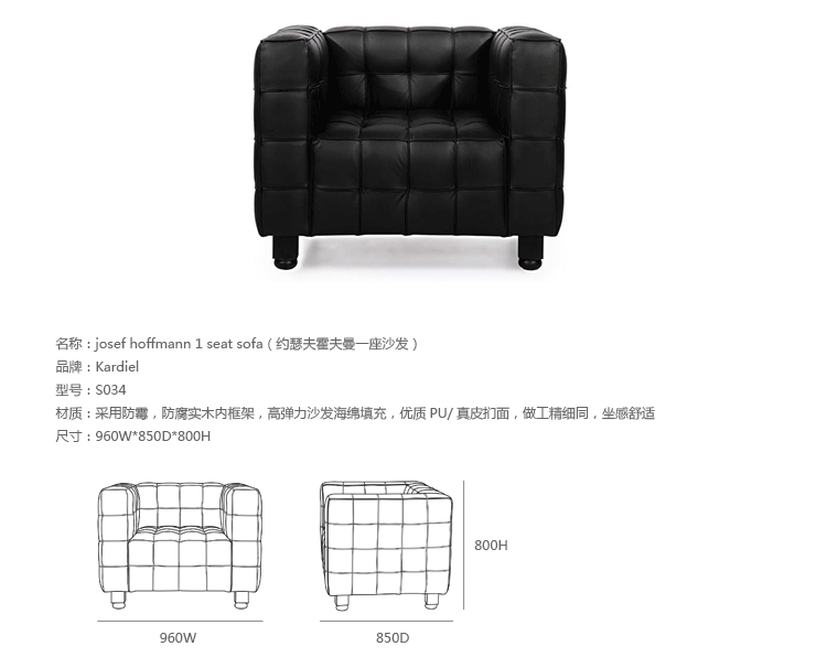 This high quality reproduction of the Josef Hoffmann Kubus Chair features a handcrafted hardwood frame graciously lined with polyurethane foam. The surface is luxuriously soft to the touch,compliments of its premium 100% Top-Grain Aniline leather upholstery. This premium reproduction is generously proportioned to original full-scale size and cube count.Precision stitched & aniline leather piped tactile cubes create a thick body of cushioning that is so comfortable you’ll understand why this sofa has been a modern classic for nearly a century.For those looking for historic significance in midcentury modern furnishings,the Hoffman Kubus is a certain candidate.