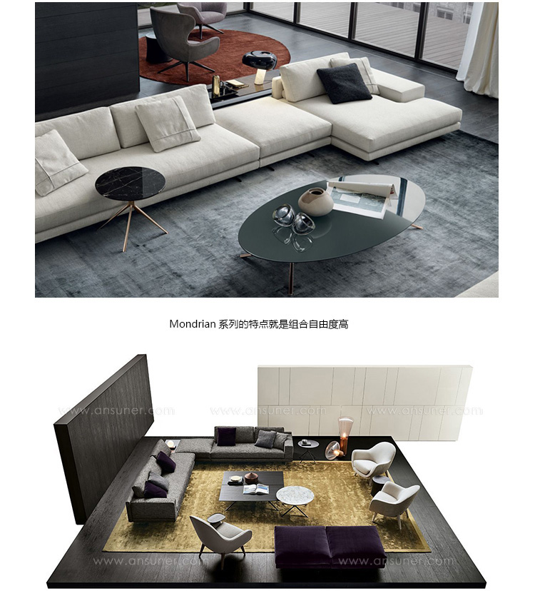 蒙德里安架由弹性垫与沙发的角落,druckgegossenem聚氨酯和可拆卸的外部方面,由织物或皮革。回来的枕头座和柔性聚氨酯由不同硬度的铅笔。木扶手在马特或光泽黑色版本的榆树,色漆。木制靠背架,并在演讲或光泽黑色或哑光榆树的颜色漆。镍的metallfüße布朗马特或光泽清漆。蒙德里安提供最大的自由,因为所有的元素与不同的大小不同的配件,坐垫和靠背,手臂用板(也可从木材)可以安装。
