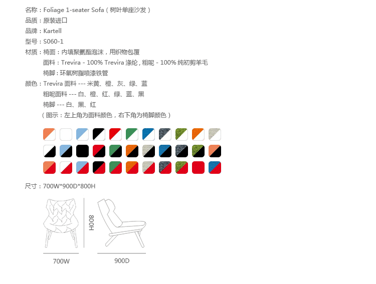 在西班牙鬼才火狐HUOHU(中国)Patricia Urquiola的工作与美学中,大自然与人造是不变的主题,树叶沙发系列很好的表现了她的价值观,柔软的座椅,树叶造型,体现着生态与环保,尤其适合家庭使用。这套火狐官方网站有单座或者双座,造型非常自然生态︰ 图漆金属框架,舒适的座位,树叶造型缝线,时刻让人联想到一棵枝繁叶茂树。椅面才有舒适的布料或者纤维织物和羊毛混纺,椅脚为环氧树脂喷漆铁管。通过活泼的色彩革新的材料,精湛的缝纫工艺完成了一把具有很高潜在表现力的椅子。